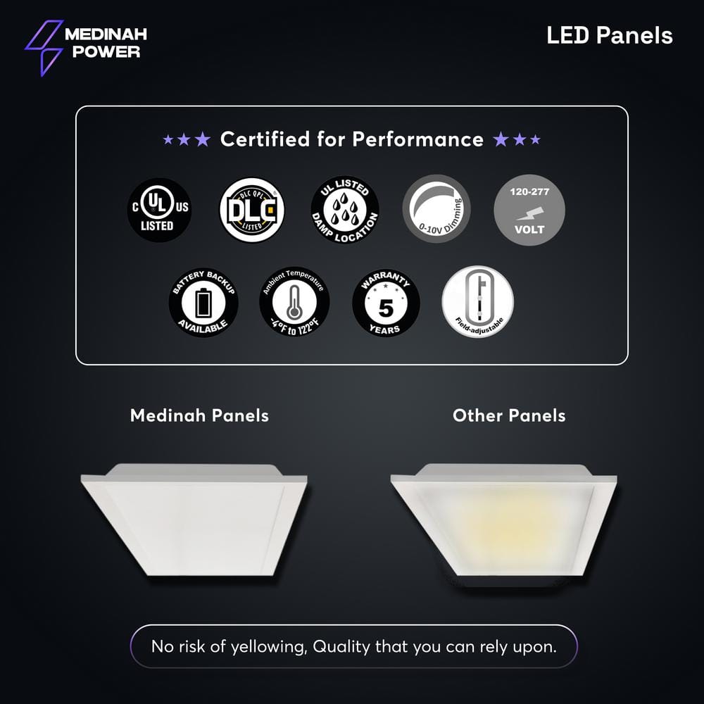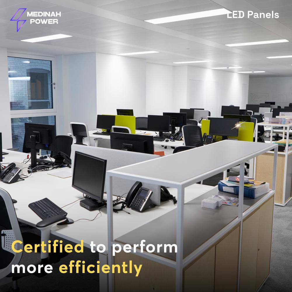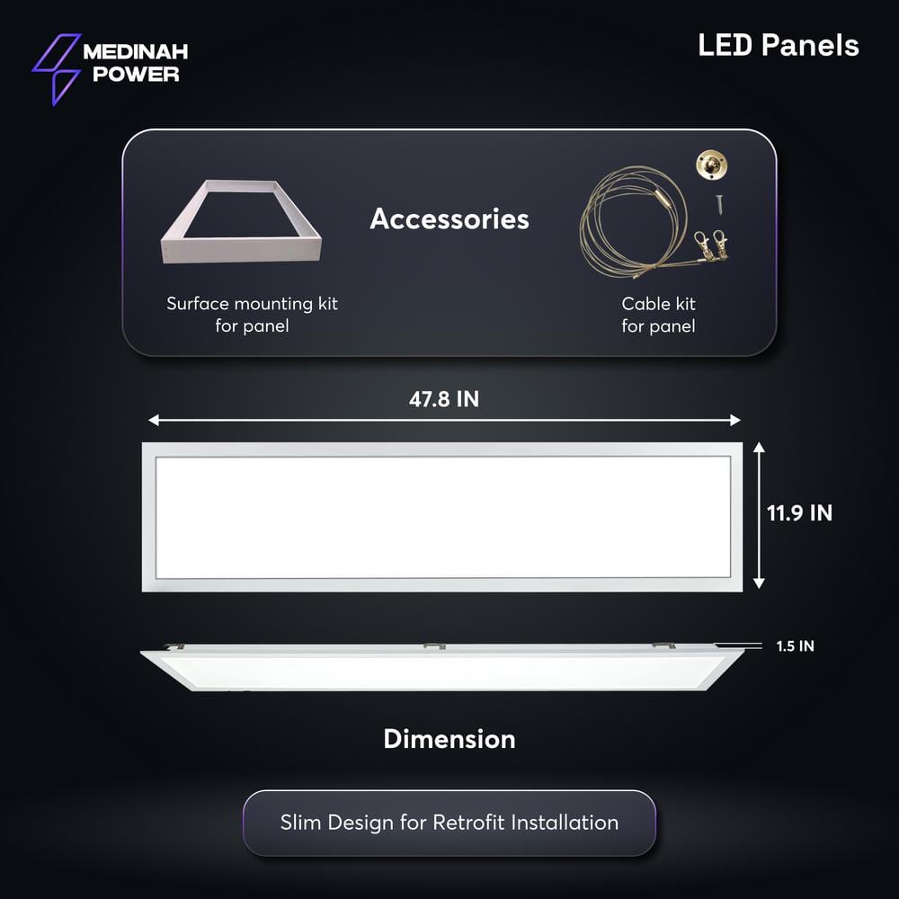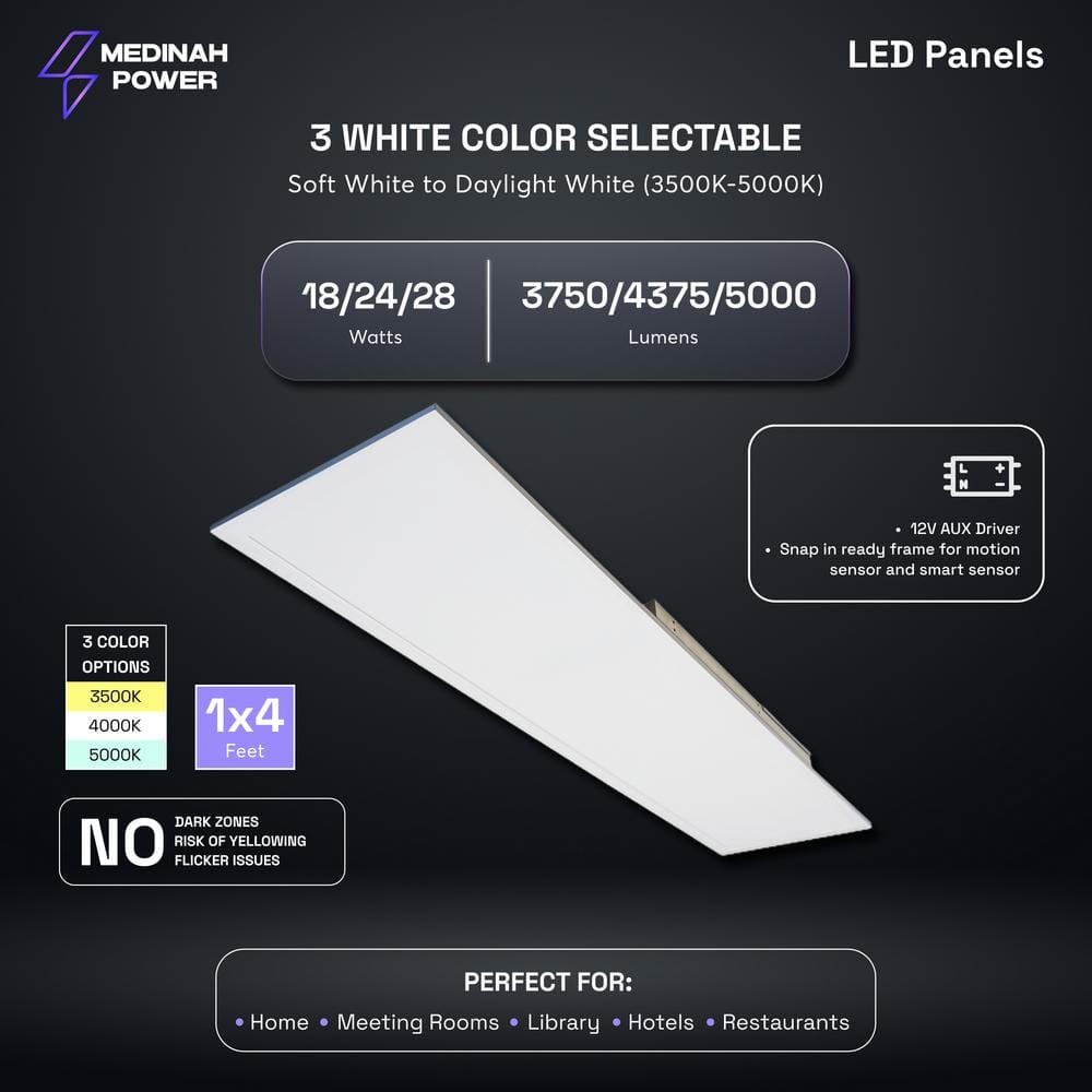 The MEDINAH POWER 1x4 LED Back-Lit Panel offers groundbreaking lighting versatility with adjustable wattage and color temperature settings. Engineered for efficiency and equipped with a 12V auxiliary driver, this panel illuminates spaces with superior clarity while offering energy savings and a remarkable 100,000-hour lifespan. Ideal for both commercial and personal use, it seamlessly integrates into any environment for optimal lighting performance.