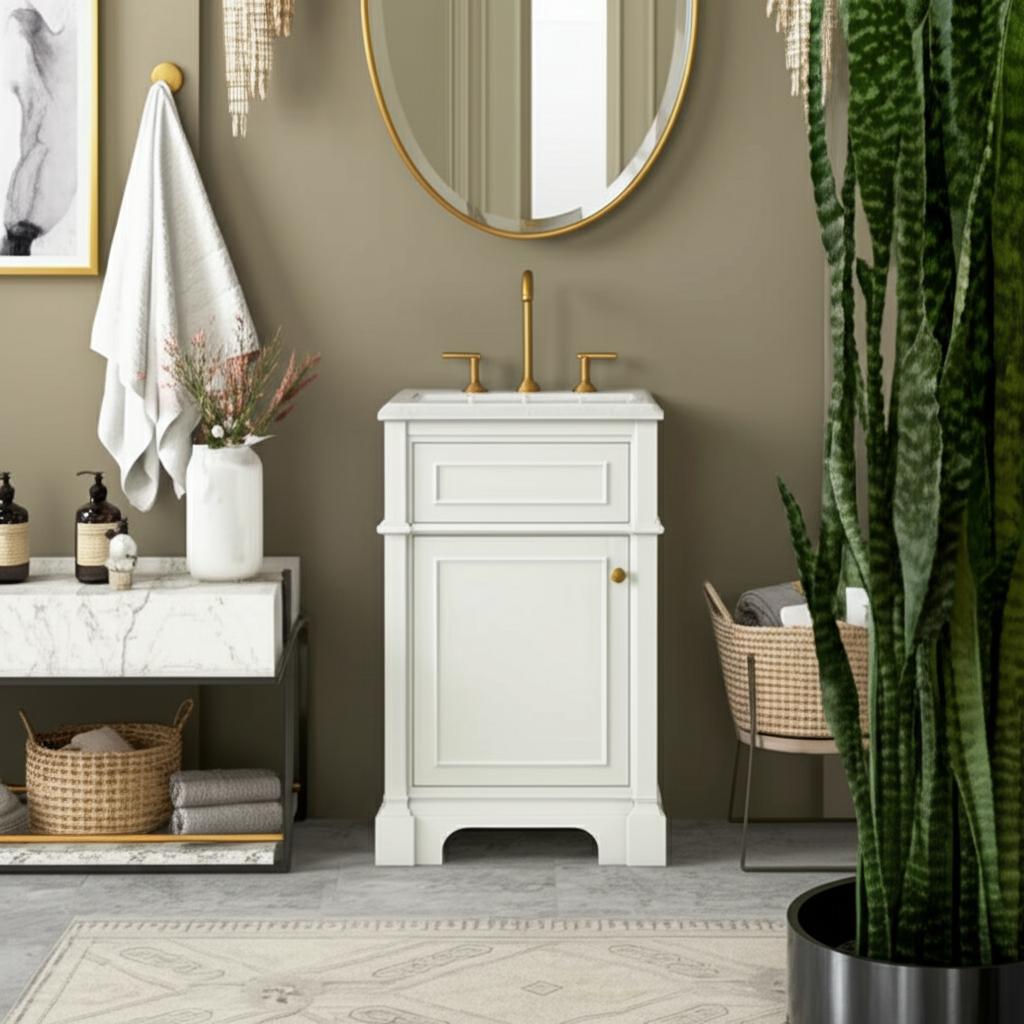 The Melpark 24-inch vanity combines modern elegance with practical functionality. Featuring a white engineered marble top, brushed nickel and gold hardware options, and a unique tilt-down drawer, this vanity is perfect for enhancing any bathroom space.
