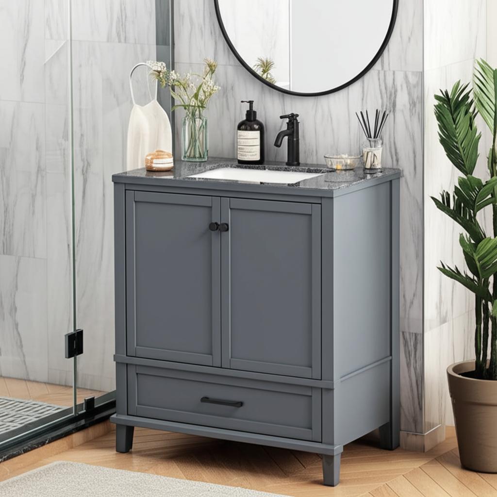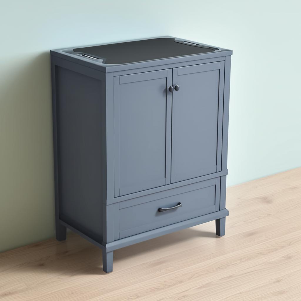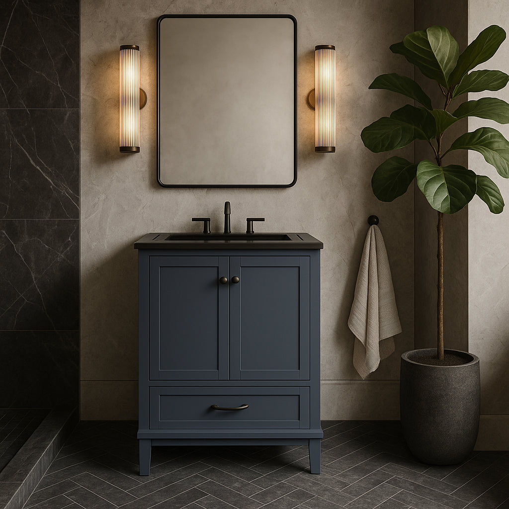 The Merryfield Vanity Cabinet combines durable construction with elegant design, featuring a Dark Blue-Gray finish, matte black hardware, and soft-close functionality. Fully assembled for convenience, it’s the perfect addition to any bathroom.