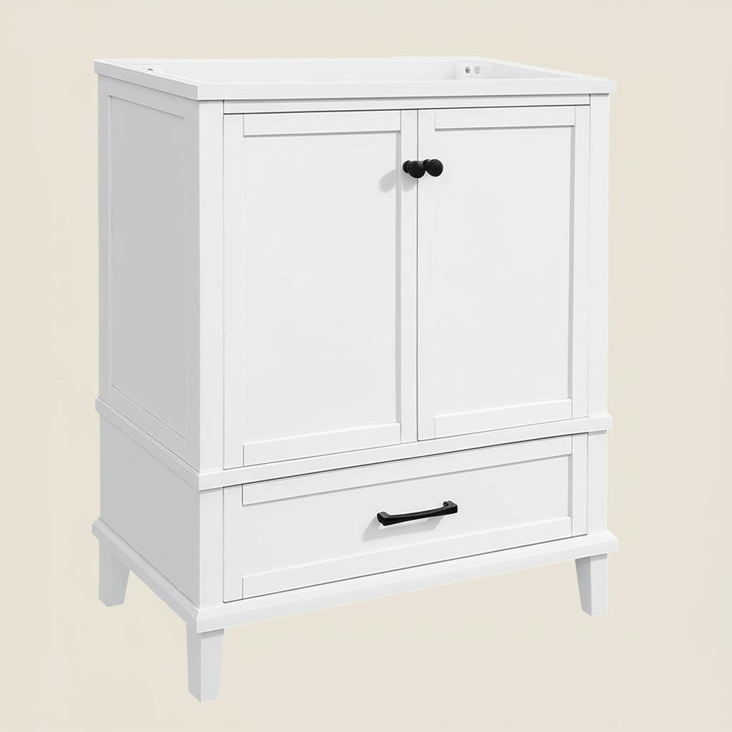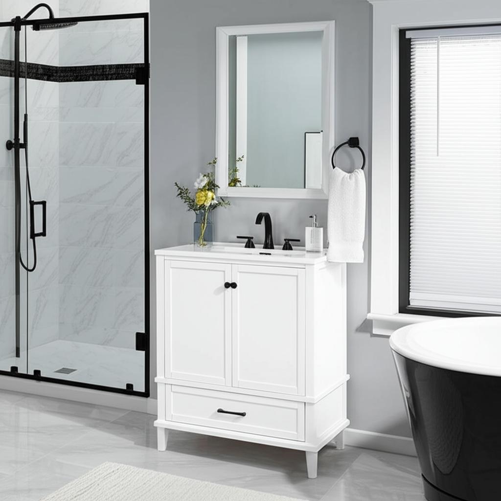 Transform your bathroom into a sanctuary of style with the Merryfield Vanity Cabinet. Its clean white finish and matte black hardware create a striking contrast, embodying modern sophistication. The soft-close doors and drawer add a touch of luxury, while the adjustable levelers ensure perfect placement even on uneven floors. Pair it with a marble countertop for a timeless look that exudes elegance and functionality.