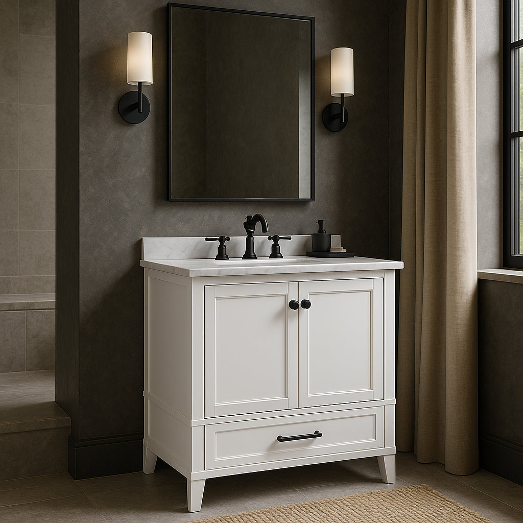 Transform your bathroom into a sanctuary of sophistication with the Merryfield Vanity. Its Carrara marble top exudes timeless elegance, while the soft-close doors and drawer add a touch of modern convenience. Pair it with sleek black hardware for a striking contrast, and style it with a vase of fresh flowers to complete the look. This vanity is the epitome of luxurious living, blending functionality with exquisite design.