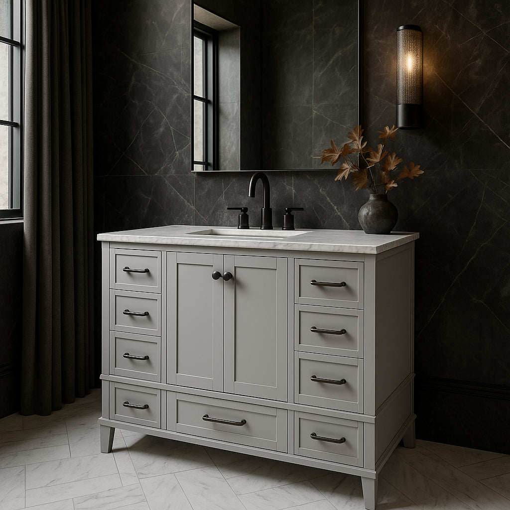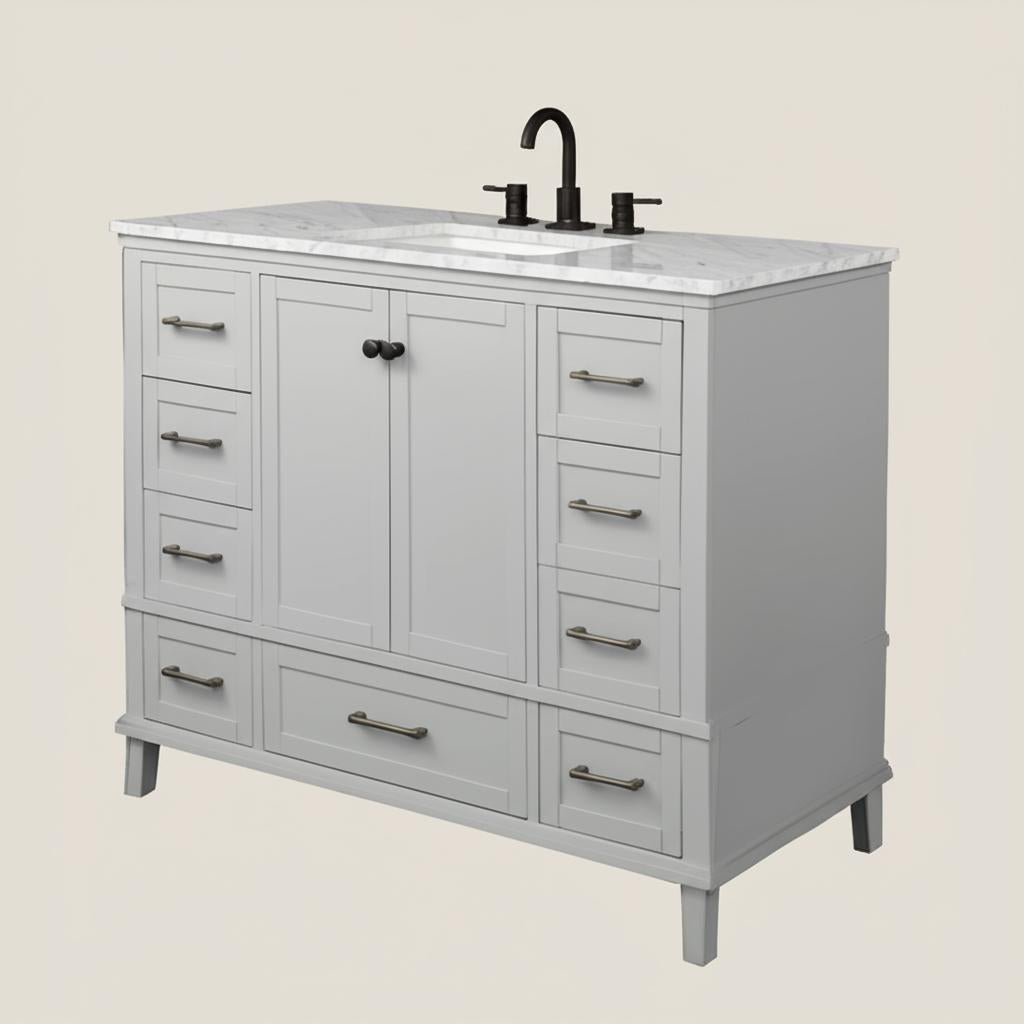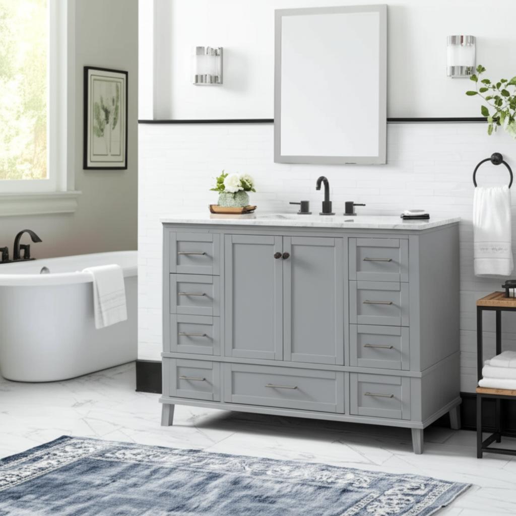 Transform your bathroom into a sanctuary of style with the Merryfield 43-inch Bath Vanity. Its dove grey finish and Carrara marble top exude timeless elegance, while the black hardware adds a modern touch. The soft-close doors and drawers provide both functionality and a sense of luxury. Pair it with minimalist decor and a matching mirror to create a cohesive and sophisticated space.
