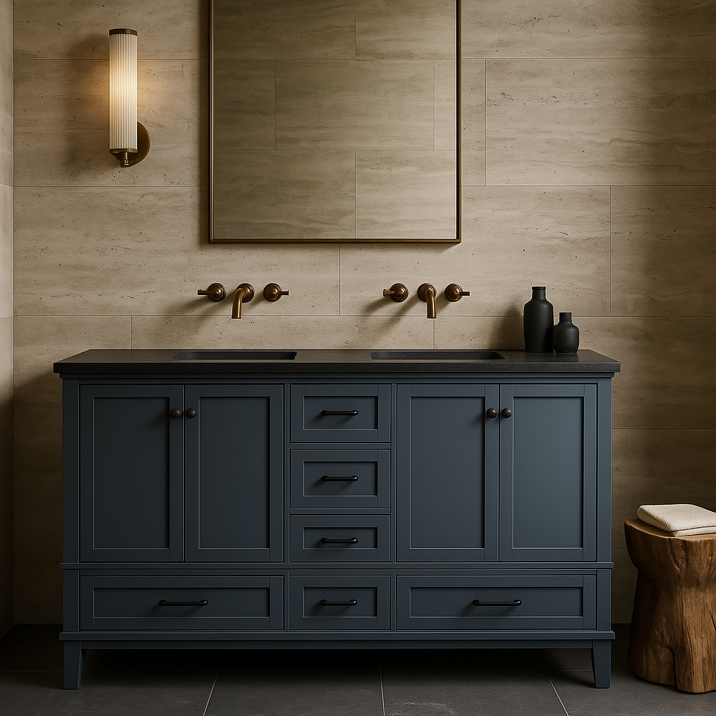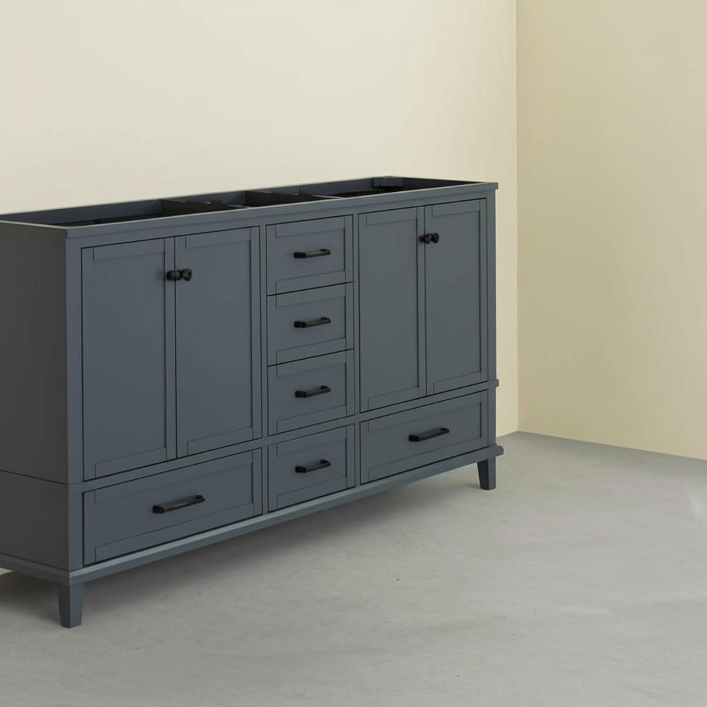 The Merryfield Vanity Cabinet combines durable construction with elegant design, featuring a Dark Blue-Gray finish, soft-close drawers and doors, and adjustable levelers for stability. Perfect for enhancing your bathroom's style and functionality.