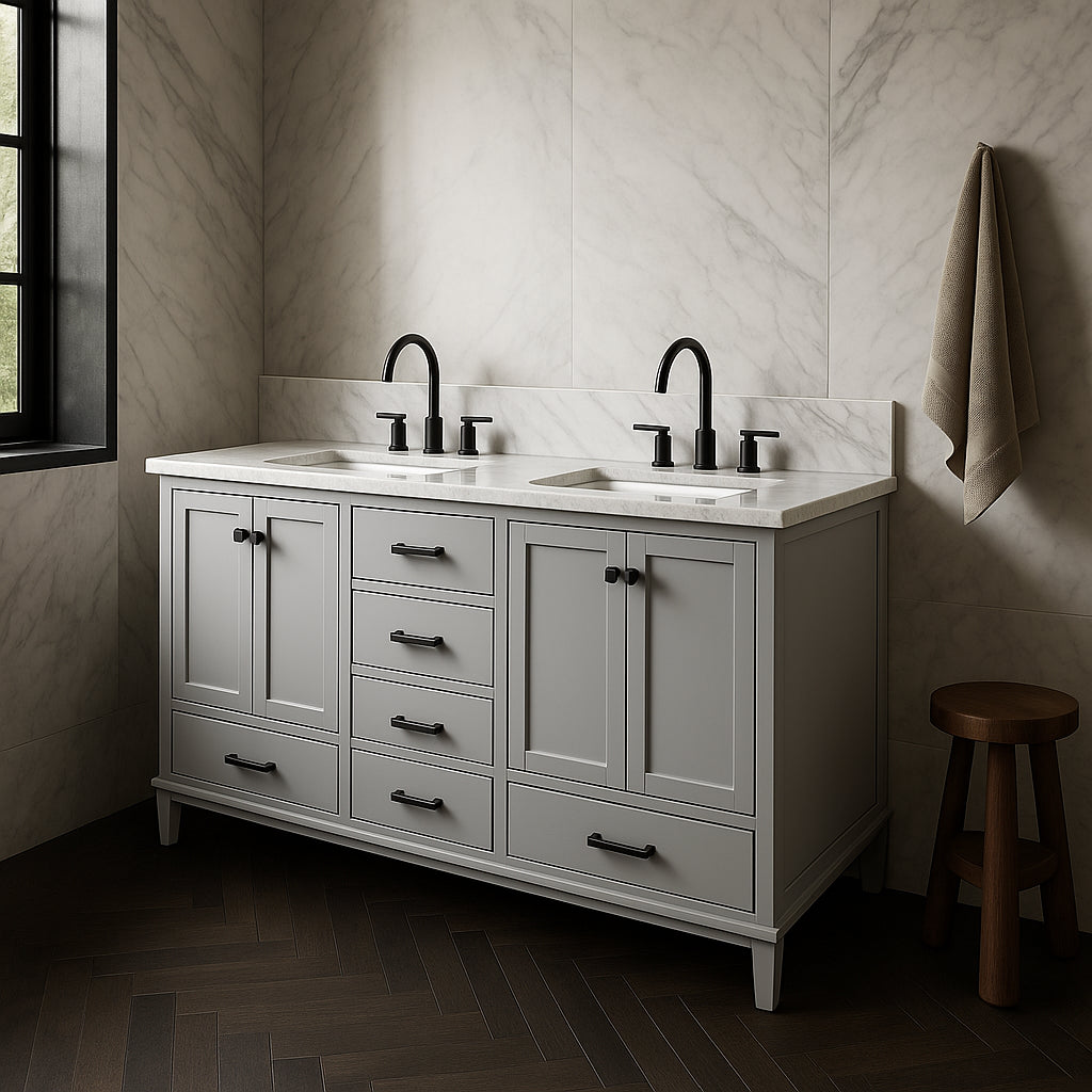 The Merryfield Double Sink Vanity combines durable construction with elegant design, featuring a Carrara marble top and dove grey finish. With ample storage and soft-close functionality, it’s perfect for enhancing any bathroom space.