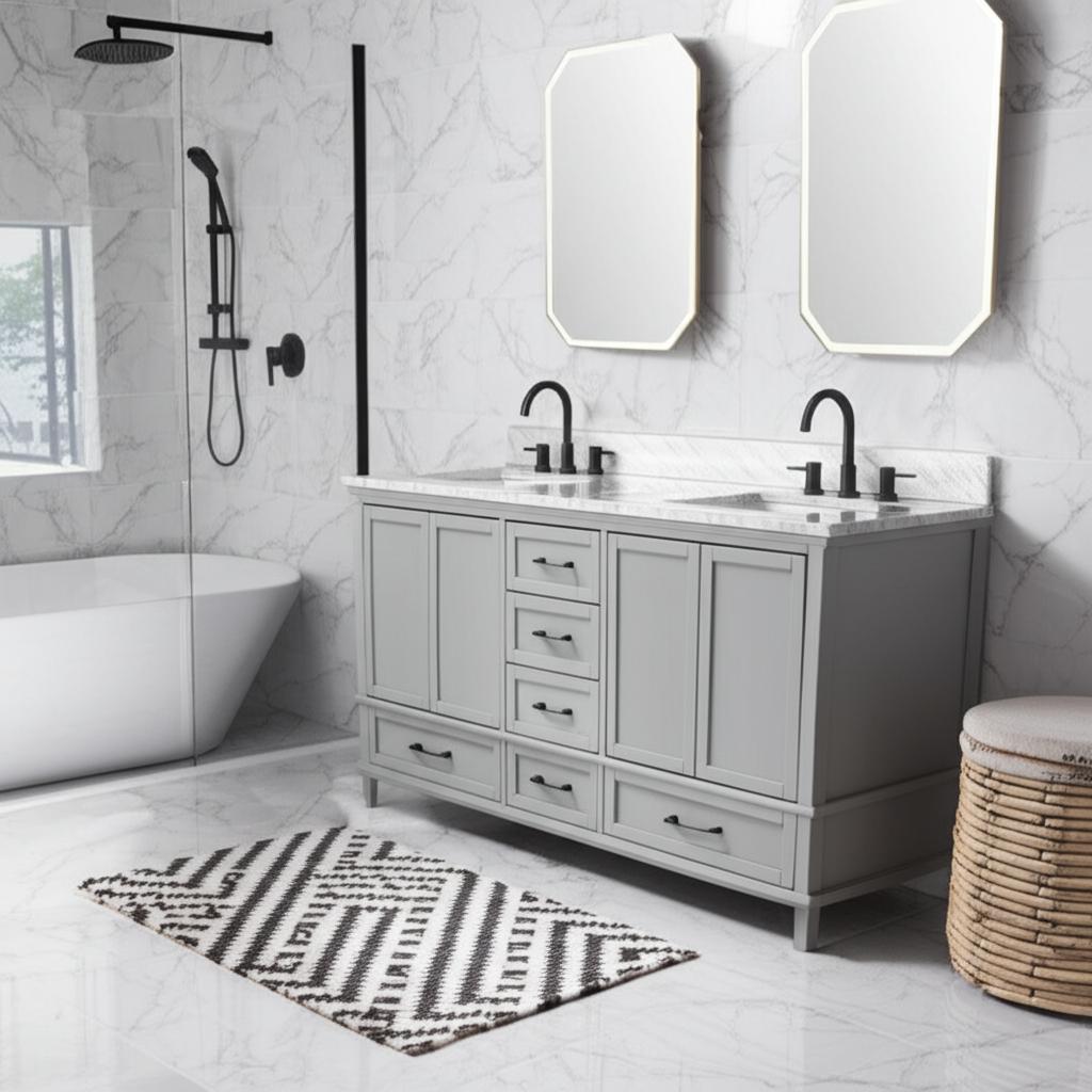 Transform your bathroom into a sanctuary of sophistication with the Merryfield Double Sink Vanity. Its dove grey finish and Carrara marble top exude timeless elegance, while the soft-close drawers and doors offer a seamless blend of style and functionality. Pair it with matte black fixtures for a striking contrast, or complement its transitional design with soft, neutral tones. This vanity is not just a piece of furniture; it's a statement of refined taste and luxurious living.