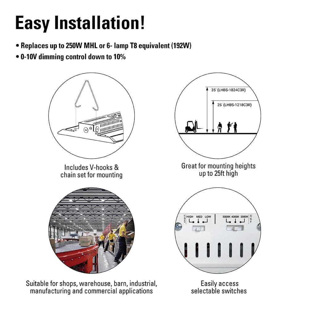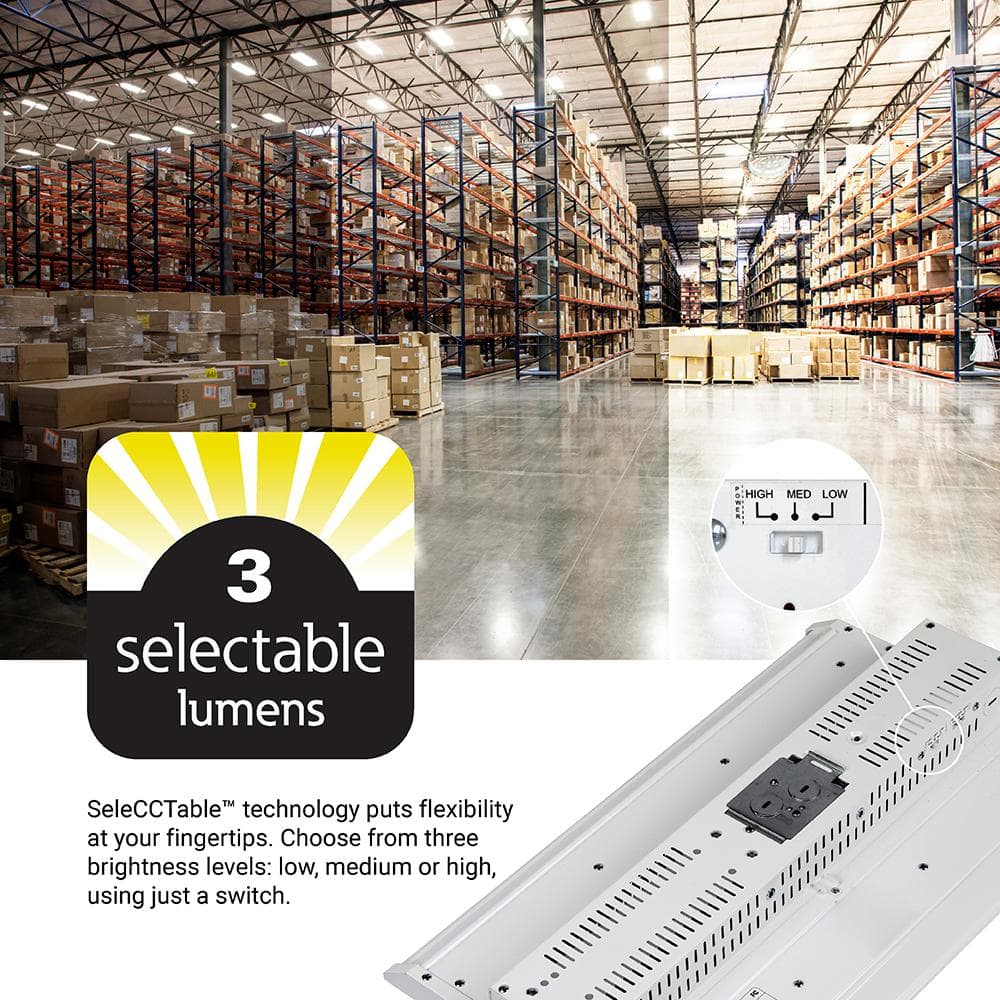 Selectability: Choose between 12000, 15000, or 18000 Lumens and CCTs of 3500K, 4000K, or 5000K for optimal lighting.