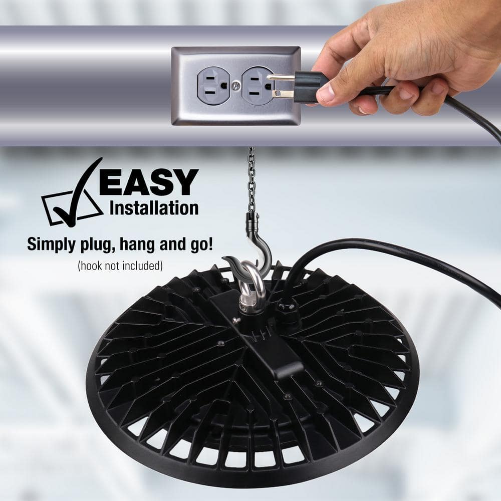 A: The Metalux High Bay Light includes a 6-foot cord and plug for easy, no-wiring-required installation. Simply plug it into a standard 120V outlet and hang it using the attached mounting ring.