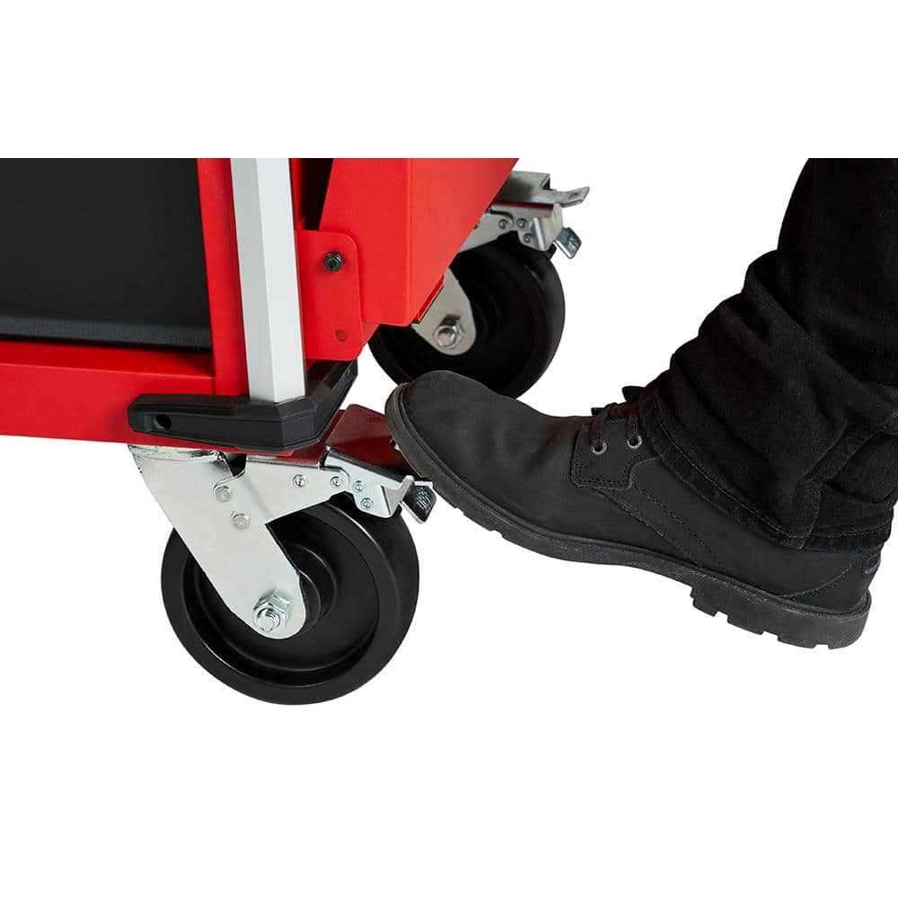 A: The tool cabinet is equipped with 6 in. x 2 in. industrial-grade casters which include 2 swivel casters with top pedal brakes for easy mobility and stability.