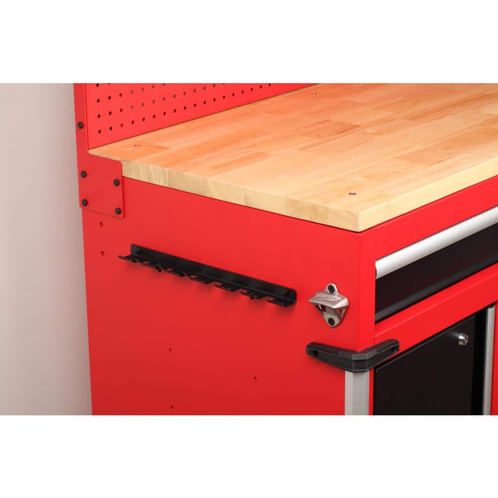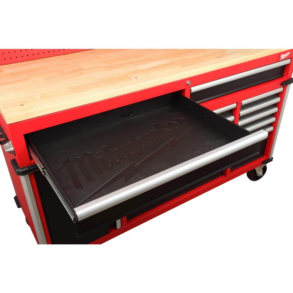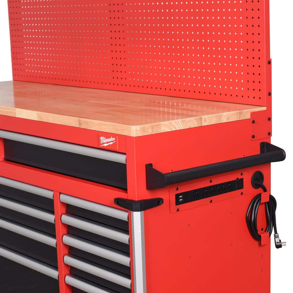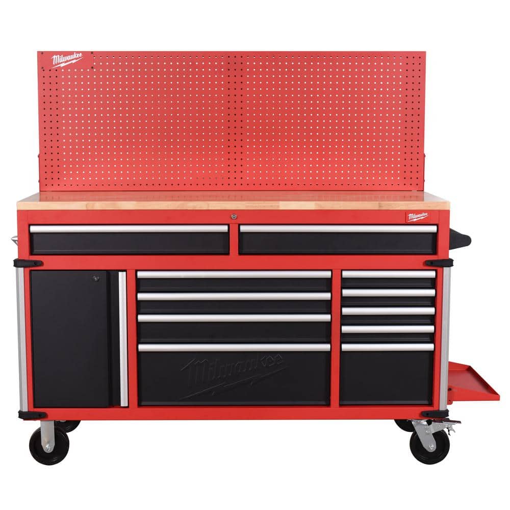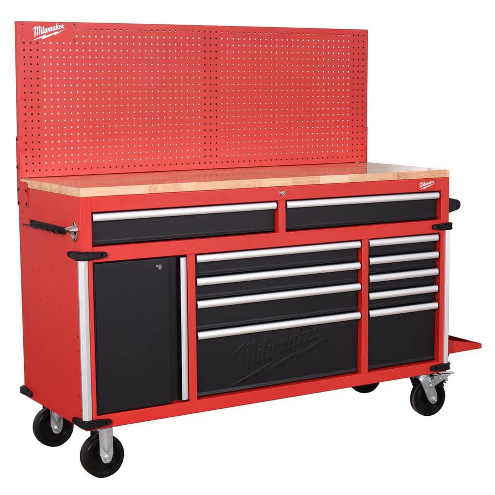 Milwaukee High-Capacity 61 in. W x 22 in. D 11-Drawer Mobile Workbench Cabinet with Solid Wood Top and Pegboard