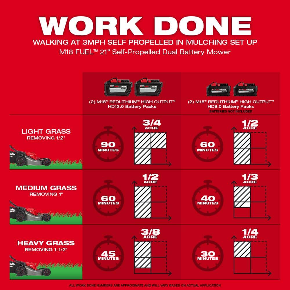 Extended Runtime: Two M18 REDLITHIUM HIGH OUTPUT HD12.0 batteries provide up to an hour of mowing for up to half an acre.