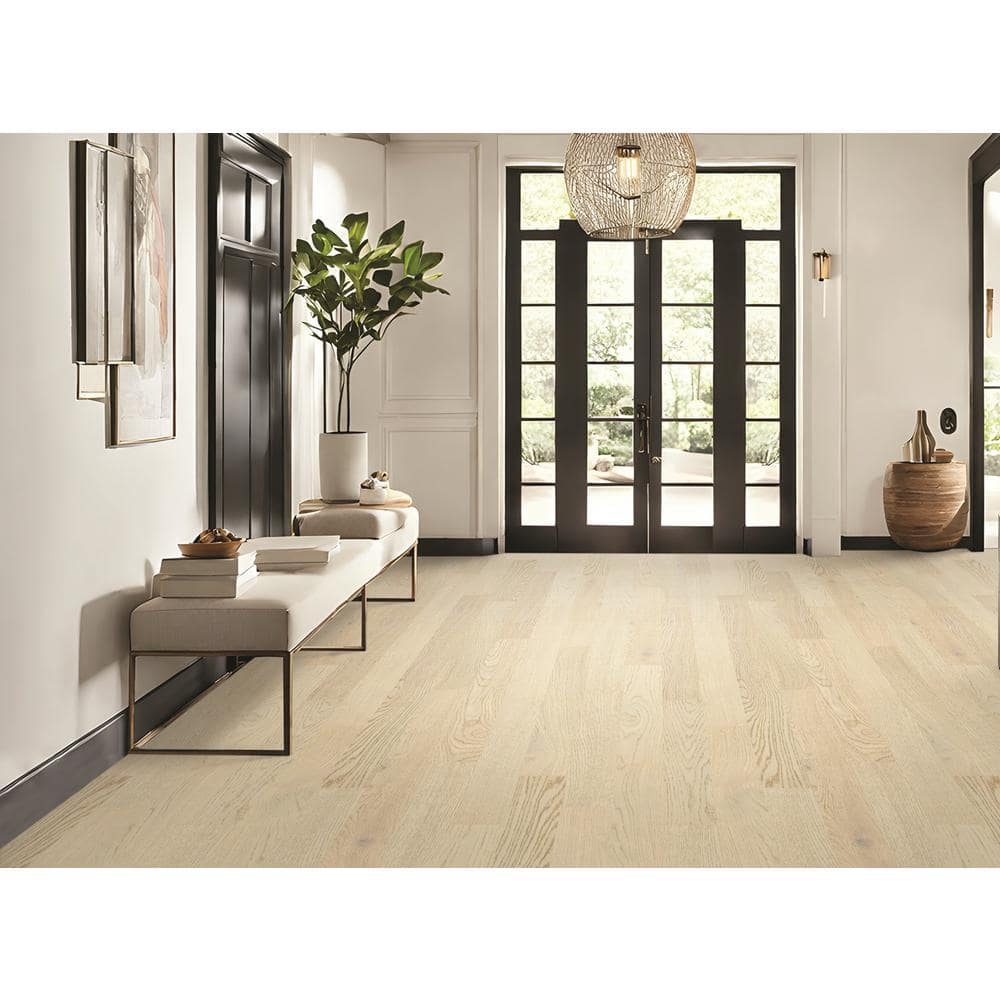 Mohawk's Smoked Oyster Oak flooring infuses timeless elegance into any space with its ethereal light hue and exquisite wirebrushed texture. The standout design feature is its sophisticated low gloss finish, enhancing the natural beauty of white oak. Imagine this as a sublime backdrop to a modern living room, paired with soft, neutral-toned furnishings. This flooring is an essential element in creating a refined, welcoming atmosphere, embraced by luxury yet grounded in durability.