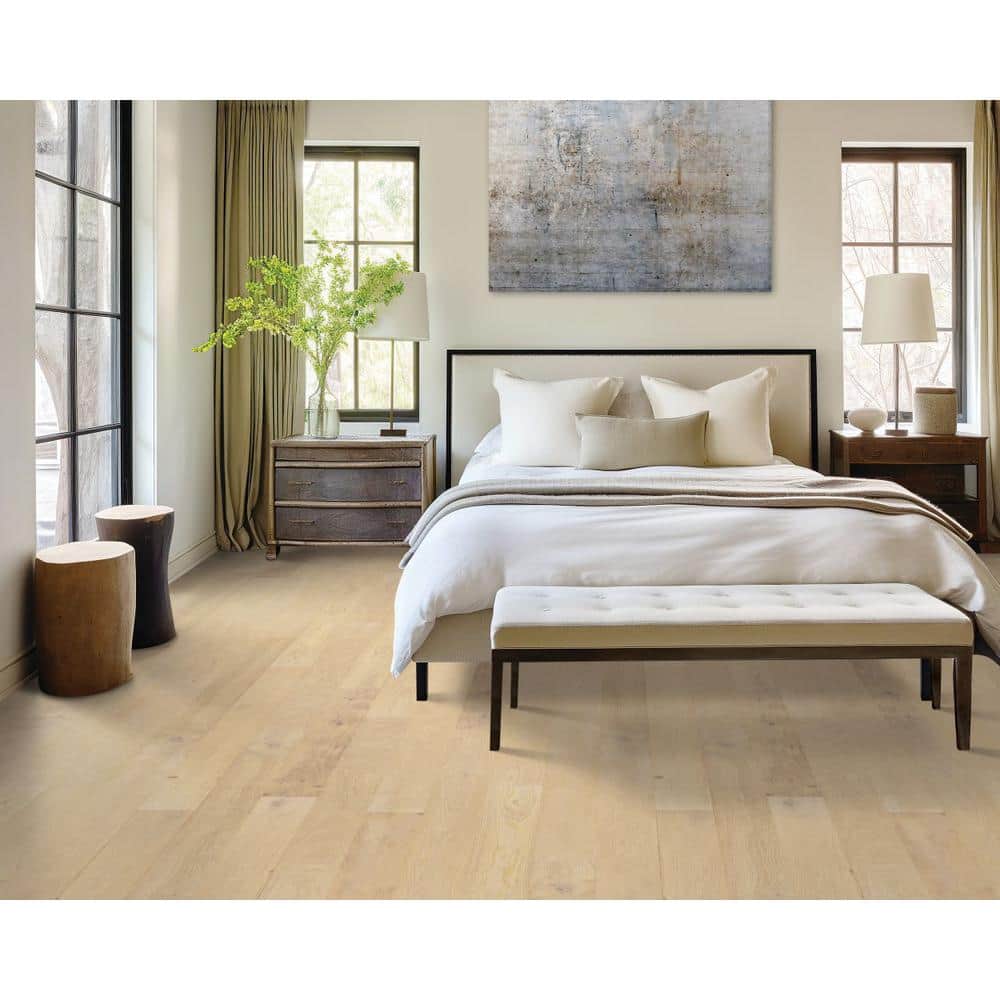 The Mohawk Village Square Conch Oak Flooring brings a breath of modern elegance into any room. With its light, wirebrushed texture and gray hues, this flooring effortlessly marries style with functionality. Imagine pairing it with plush area rugs and sleek, minimalist furniture for a chic, urban vibe. Essential for creating luxurious living environments, this flooring enhances your home with enduring beauty and contemporary charm.