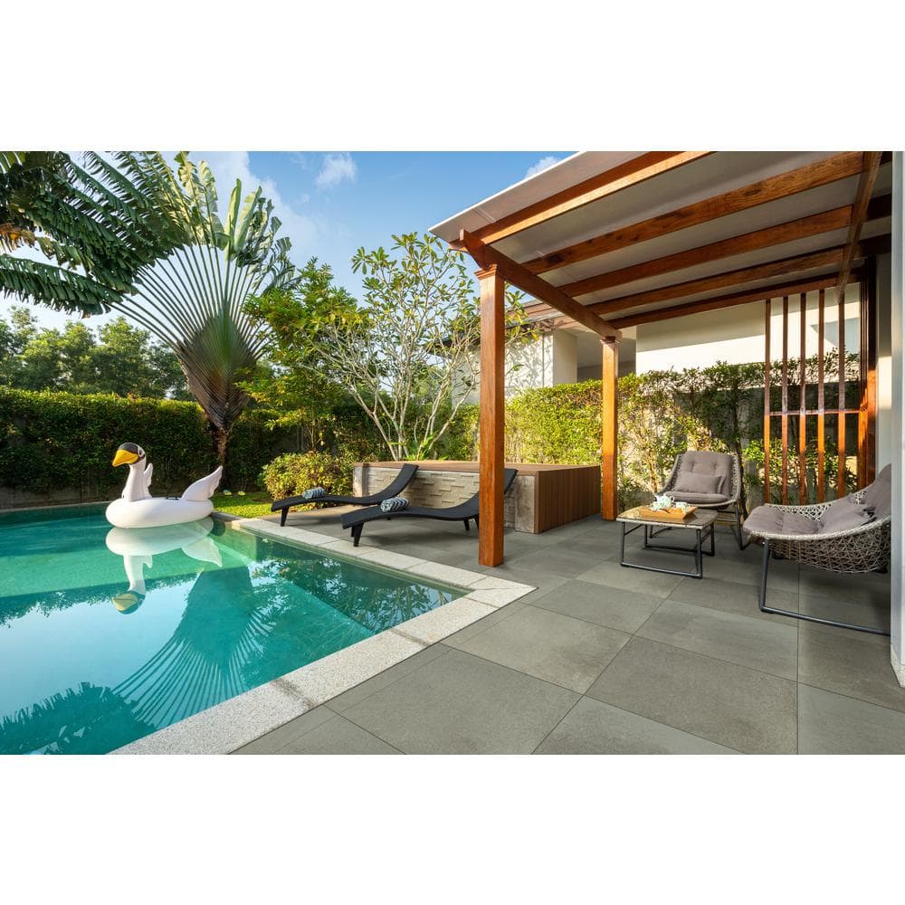 Elevate your outdoor oasis with the striking impact of MSI's Full Range Bluestone Porcelain Pavers. These ambitiously sized tiles redefine outdoor luxury, blending the refined aesthetic of natural stone with the modern excellence of precision porcelain. Imagine a seamless patio experience, bridging interior grace with exterior resilience, perfect for poolside lounging or stylish garden pathways. The undeniable allure of these pavers not only beautifies but transforms environments, making them an essential feature in luxurious, modern landscapes.