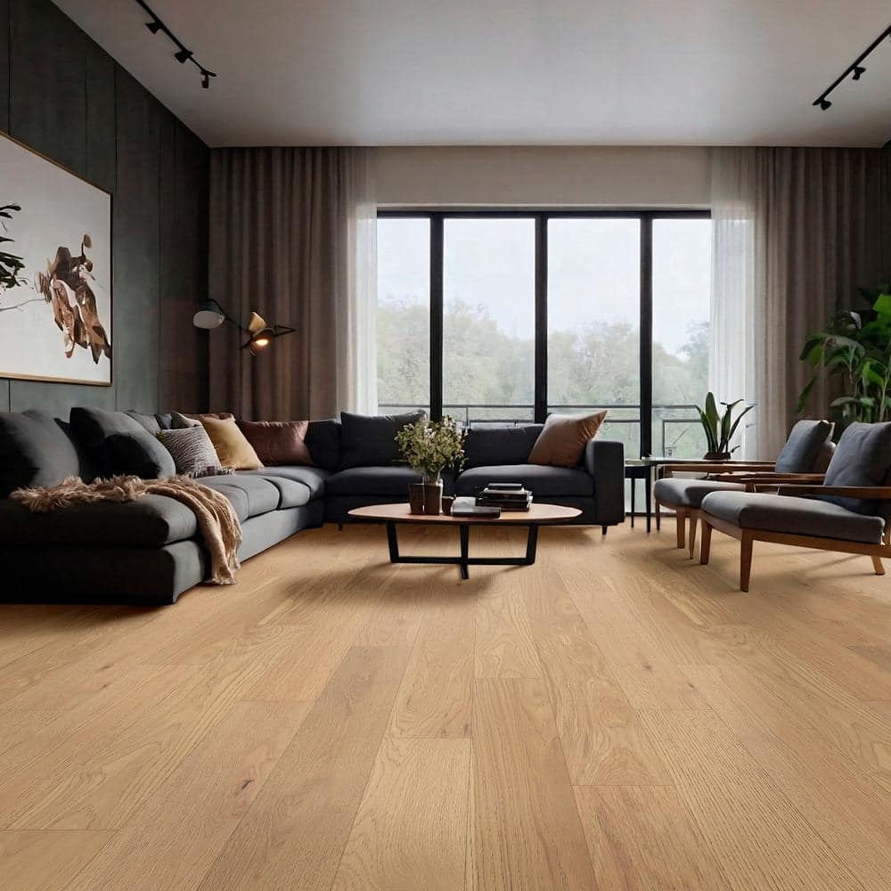 Elevate your space into a serene coastal haven with the Sandy Shores White Oak Flooring, where sunlight dances across rich, textured grains. The understated elegance of its natural blonde hues adds a touch of tranquil sophistication to any room. Style this flooring with airy, light-colored furnishings and organic textures to amplify its chic, beachy vibe. This product seamlessly blends luxury with everyday function, making it an indispensable element of any sophisticated interior.