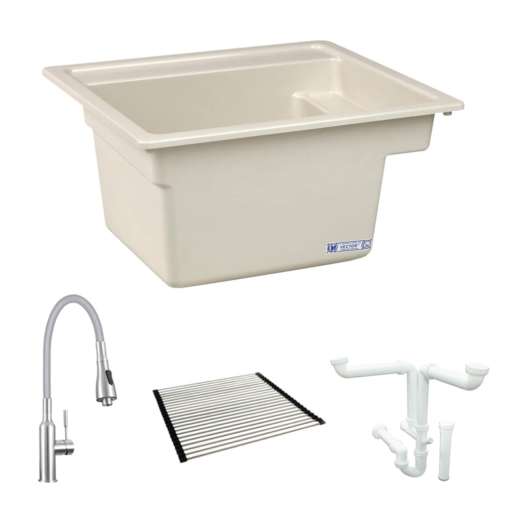 Elevate your home's utility areas with the Mustee 25" x 22" Biscuit Drop-In Laundry Sink. Expertly crafted from fiberglass and special resins, it offers exceptional durability and a scratch-resistant, semi-gloss finish. Perfect for basements, garages, and laundry rooms, this all-in-one sink kit includes a versatile faucet and drain installation kit.