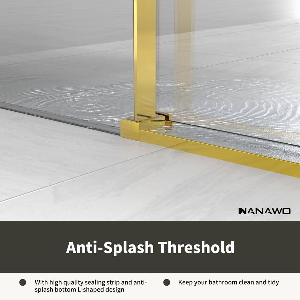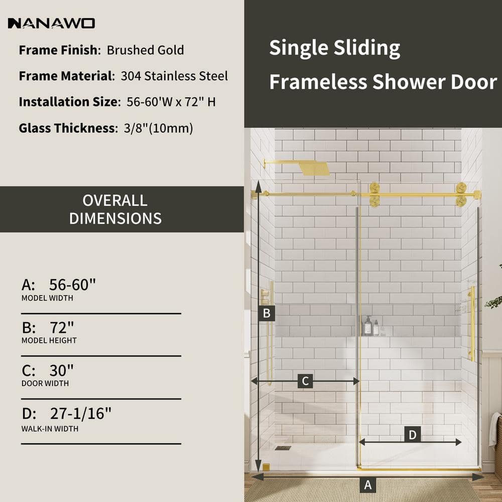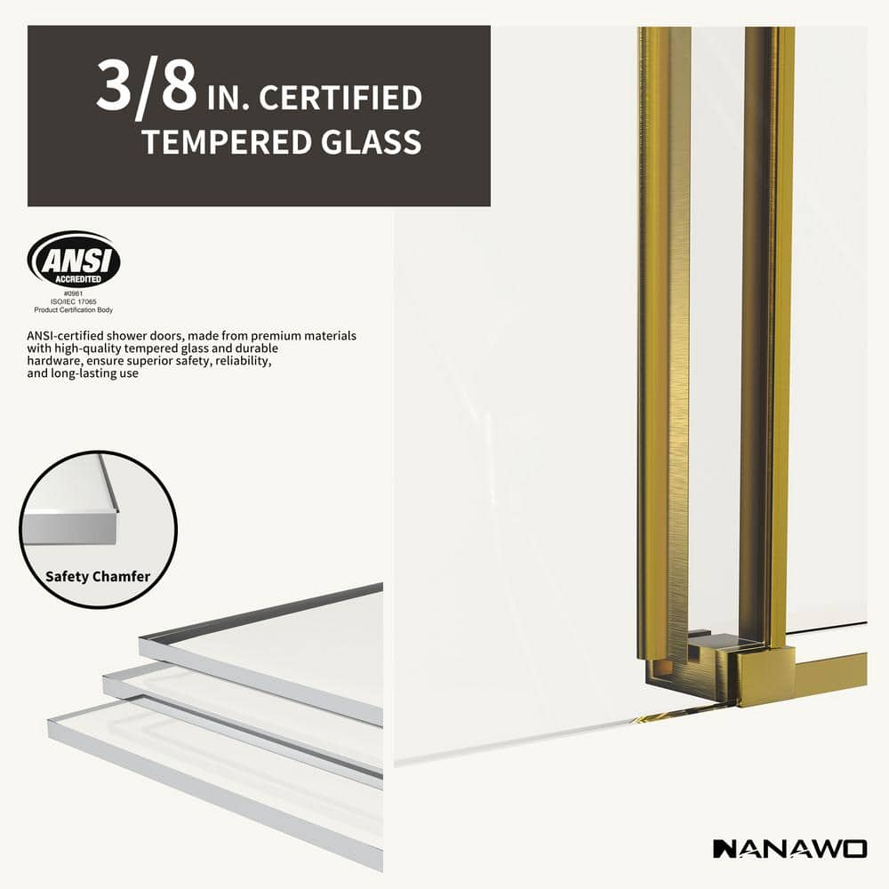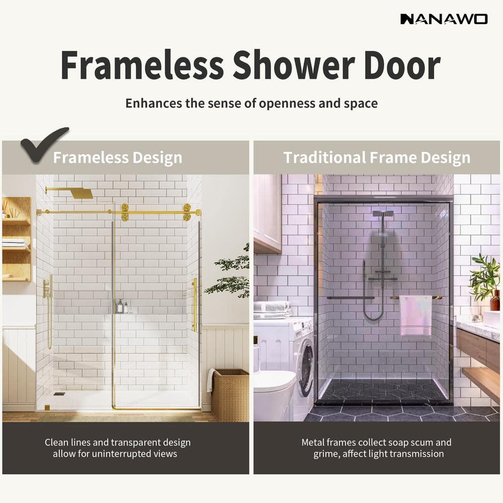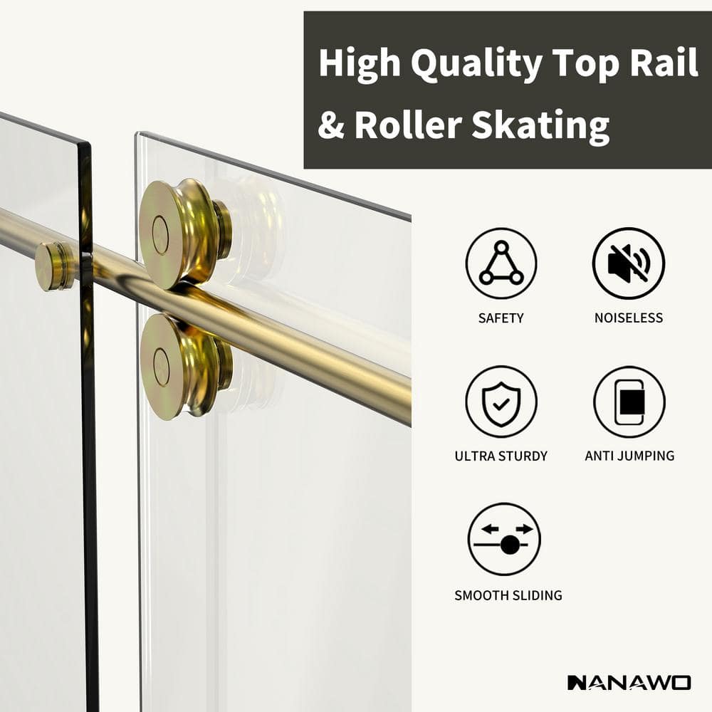 Elevate your bathroom's elegance with the NANAWO 60" x 72" Frameless Sliding Shower Door in Brushed Gold. Crafted from 3/8" tempered clear glass, this door features exquisite stainless steel hardware for a sleek finish and durability. Enjoy effortless operation with its smooth, corrosion-resistant tracks and captivating, modern design.