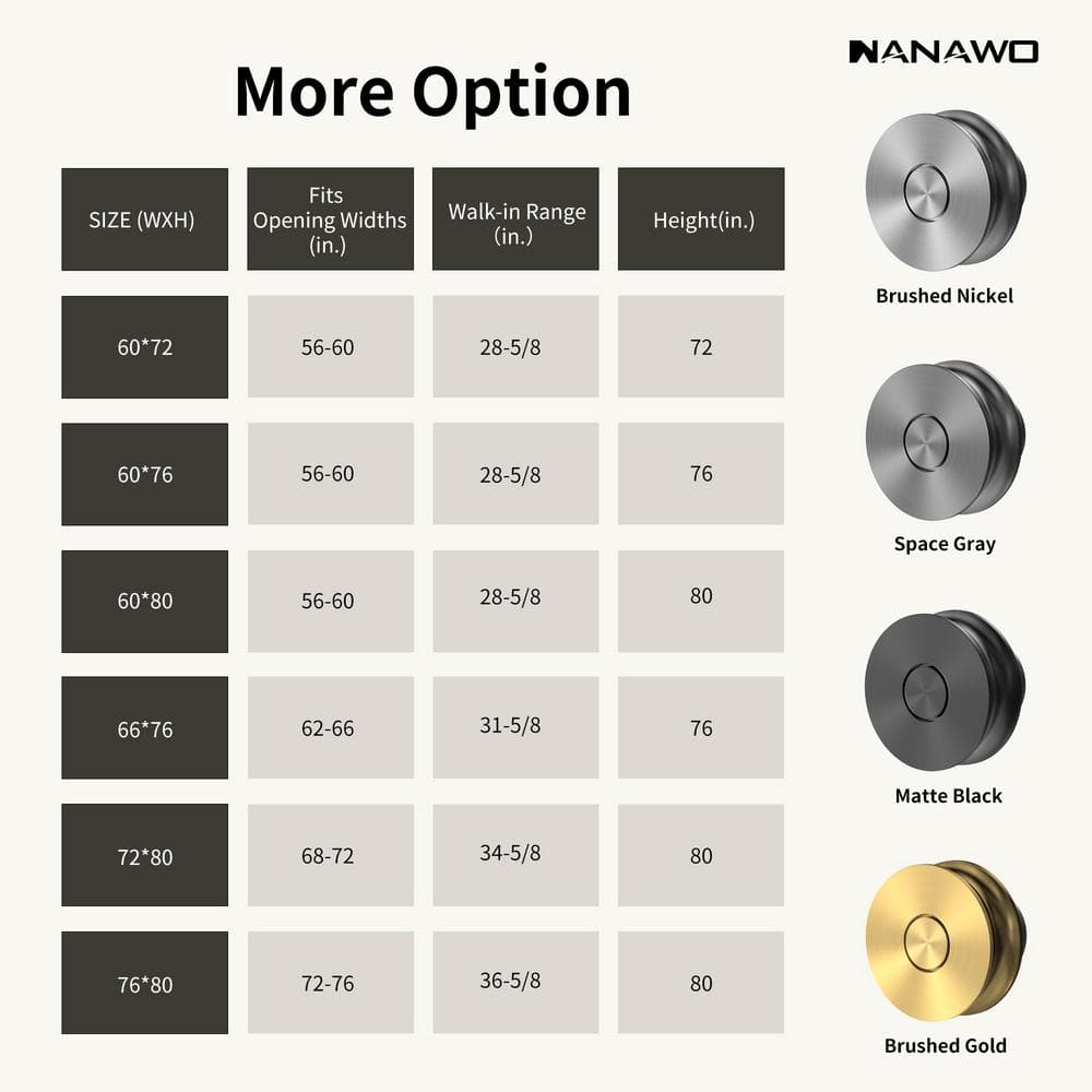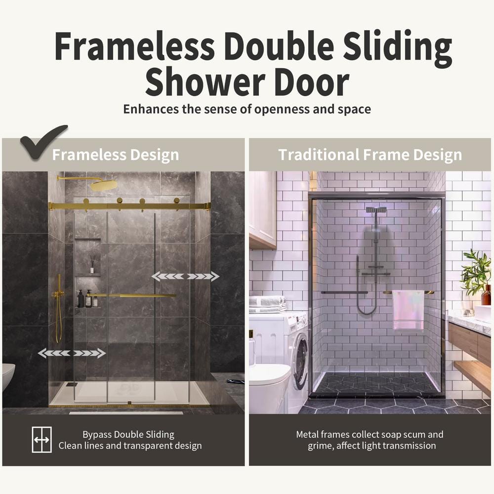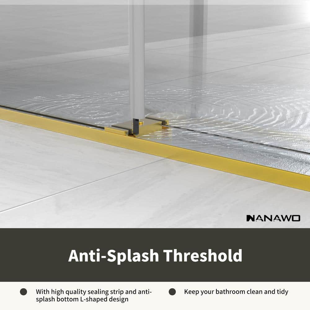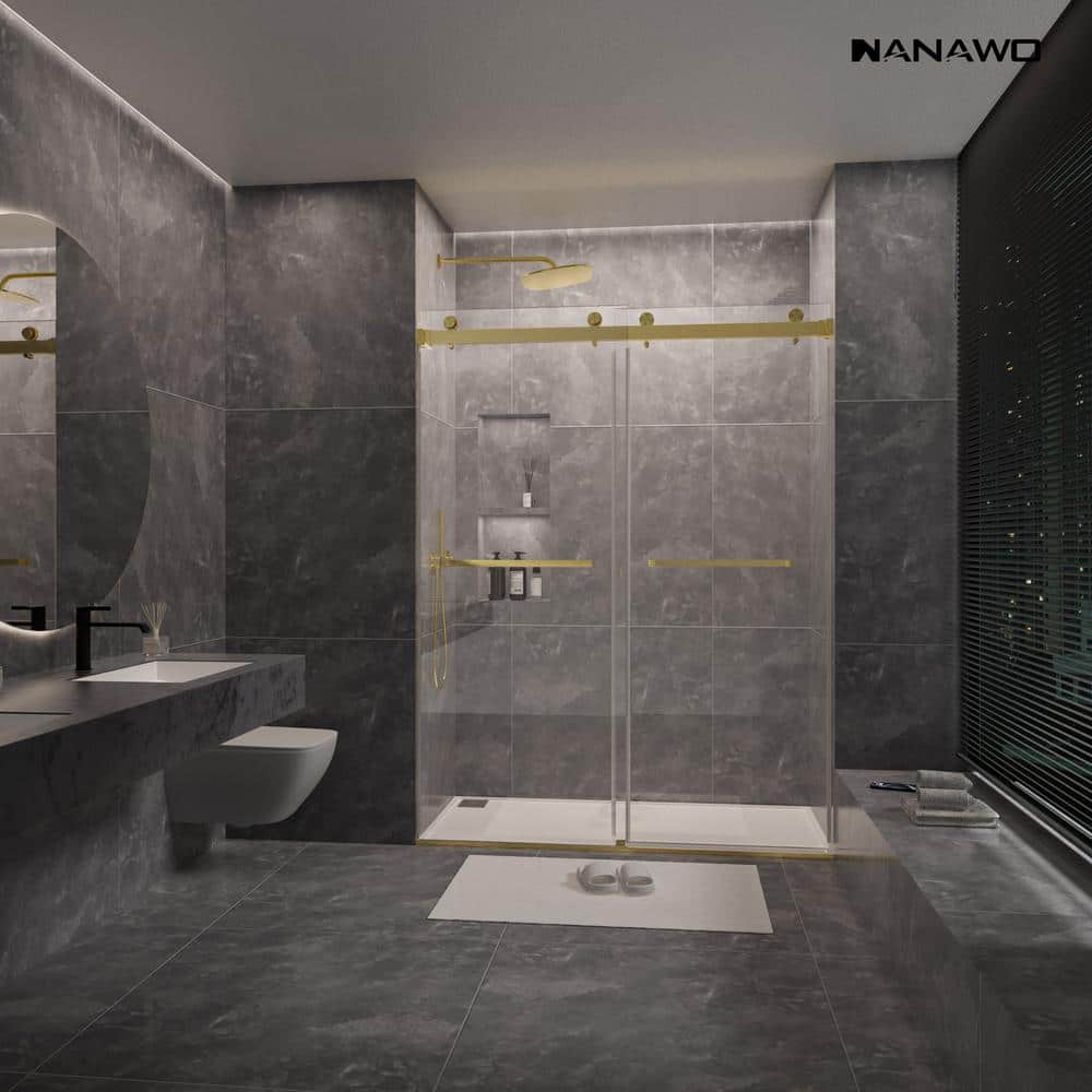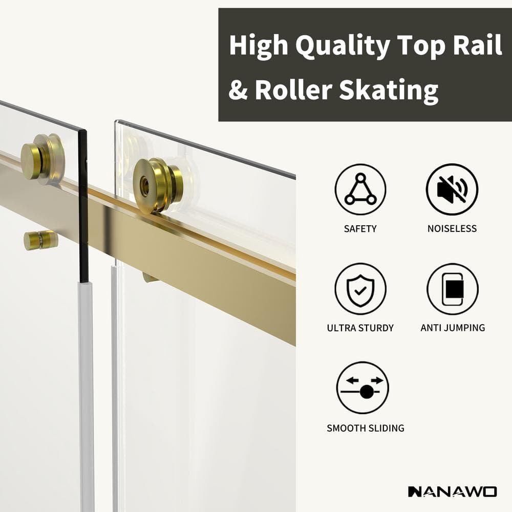 Elevate your bathroom with the NANAWO frameless sliding shower door, featuring 3/8 inch clear tempered glass paired with a stunning brushed gold finish. Its double sliding panels and sleek minimalist design ensure ease of use, while offering unparalleled clarity and durability. Enhance your space with modern elegance and superior craftsmanship.