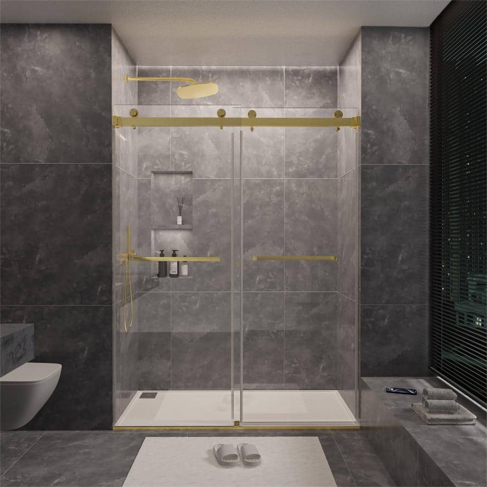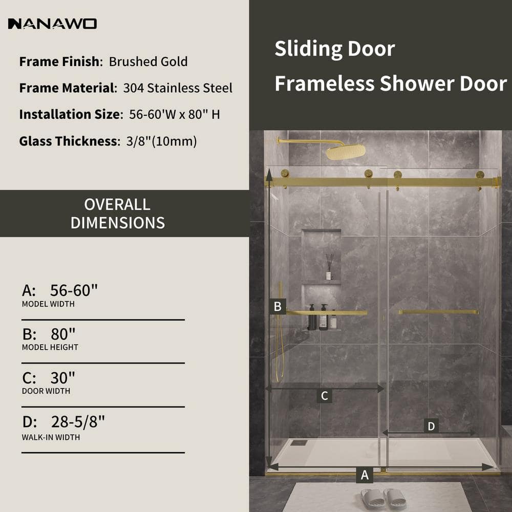 NANAWO 60 in. W x 80 in. H Sliding Frameless Shower Door in Brushed Gold with 3/8 in. Clear Glass