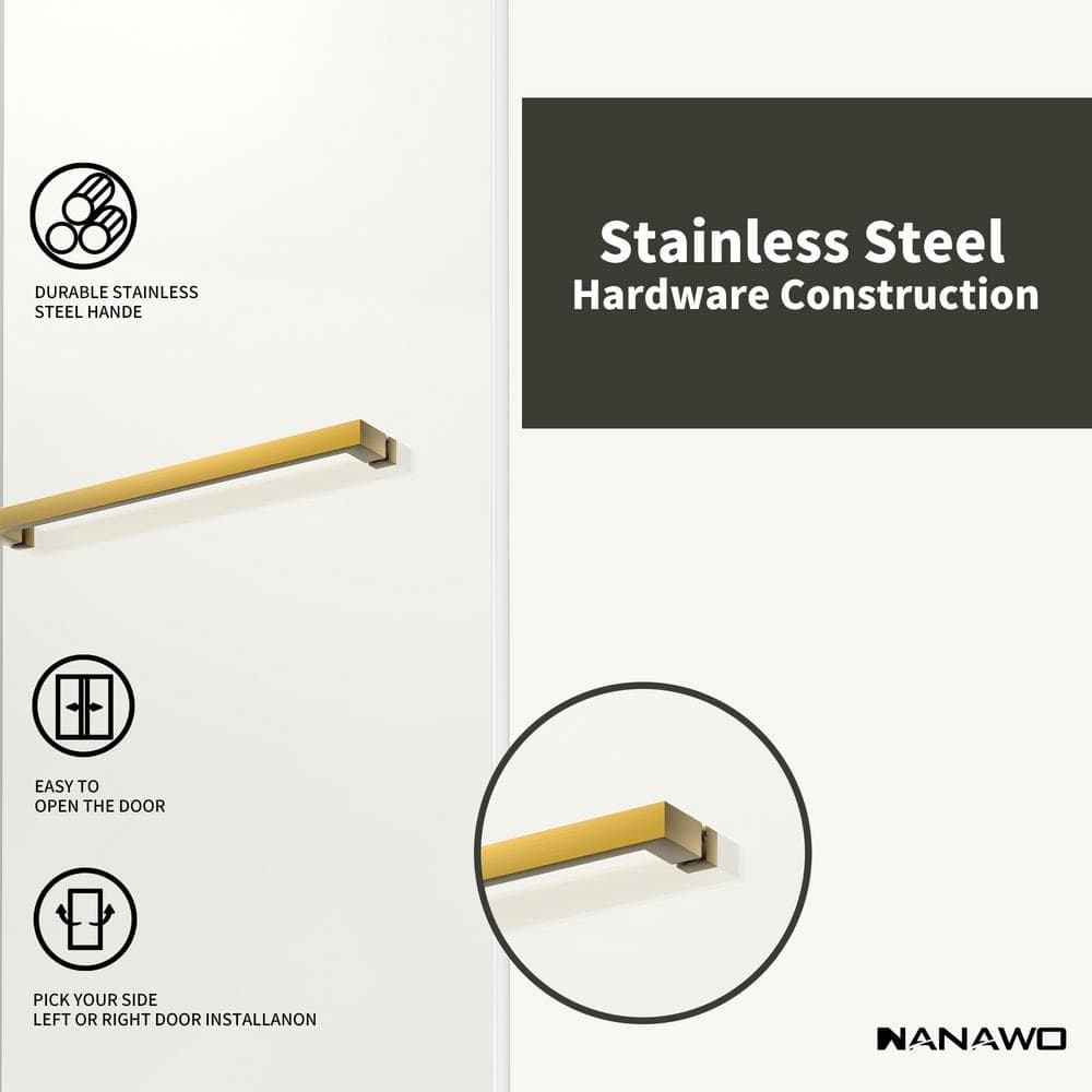 The NANAWO frameless shower door is a masterpiece that redefines bathroom luxury. Its stunning brushed gold hardware splashes sophistication across your space, while the impeccably clear glass creates a spacious and inviting ambiance. Style it with lush greenery or modern minimalistic tiles to accentuate its grandeur. This door isn’t just an addition; it’s a pivotal statement in a sanctuary that epitomizes contemporary opulence.