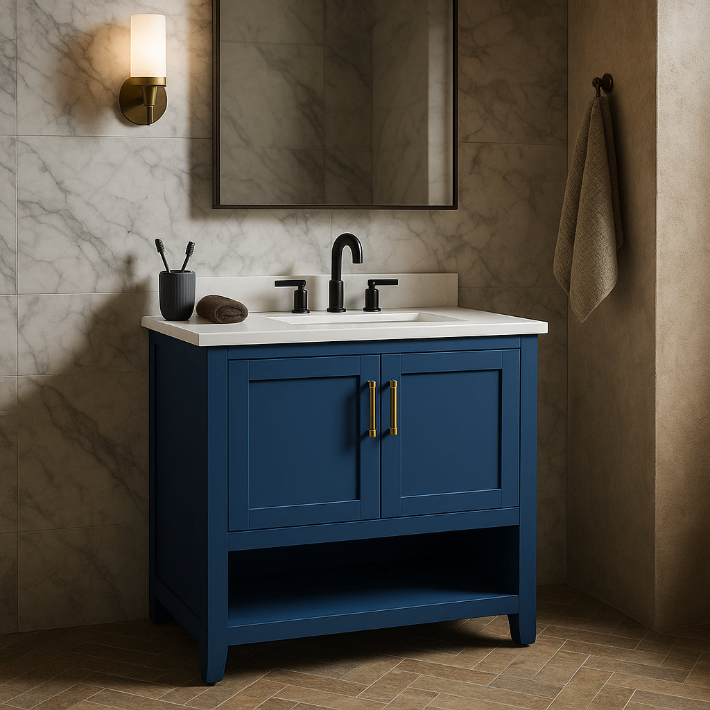 • Durable Countertop: Includes a straight edge engineered marble top with a matching 3-inch backsplash.