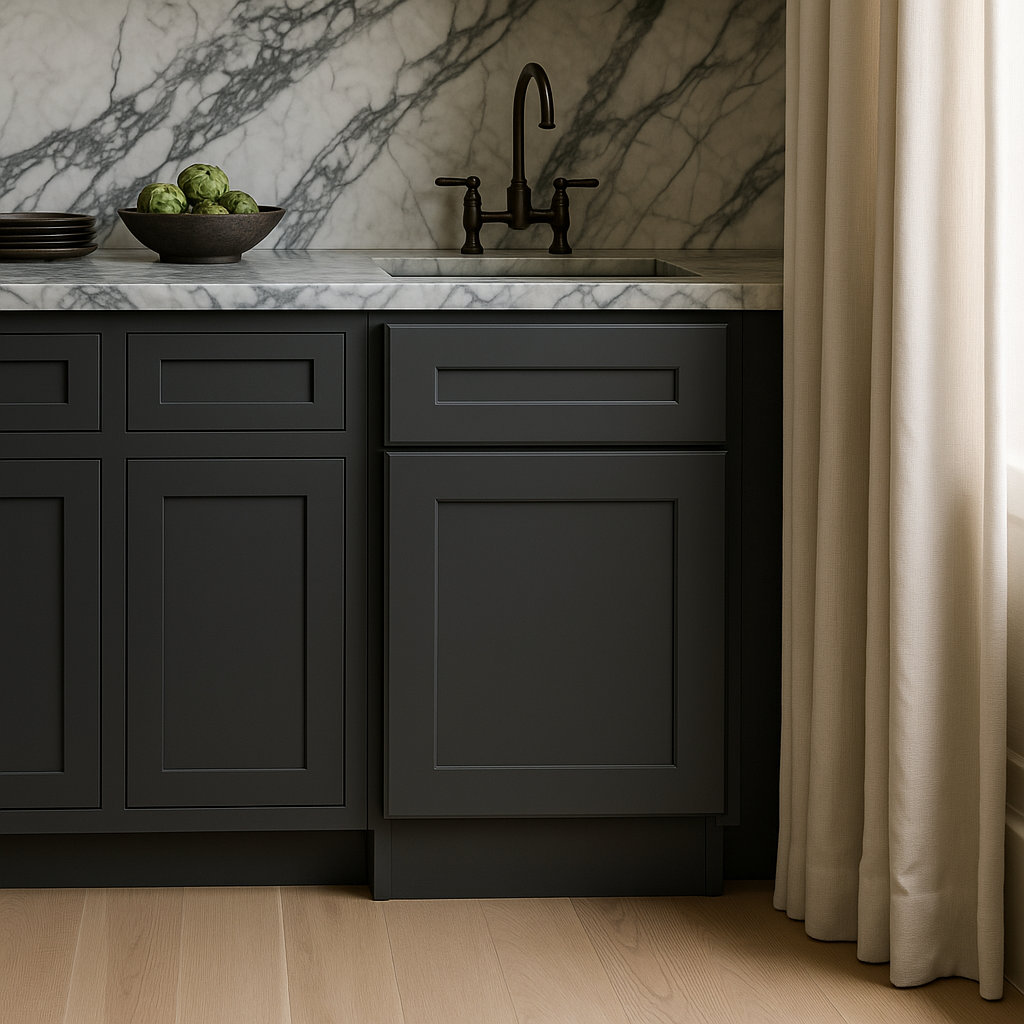 The Newport Deep Onyx Base Kitchen Cabinet combines durable plywood construction with a bold painted finish, offering both style and functionality. Featuring soft-close mechanisms and adjustable shelves, this cabinet is perfect for modern kitchens.