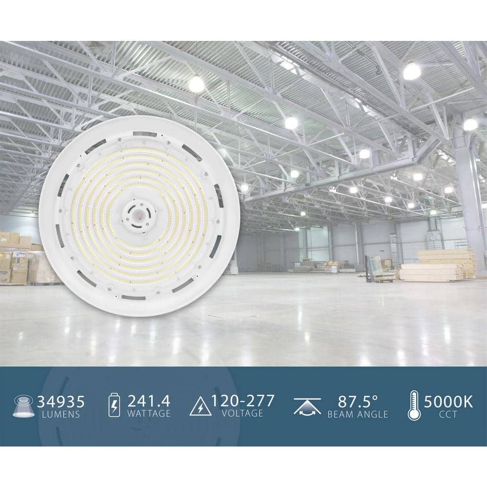 Illuminate large spaces with NICOR's HBC4 1000W Equivalent LED High Bay Light. This high-performance fixture offers a stunning 34,935 lumens at a crisp daylight 5000K, perfect for enhancing visibility in commercial settings. With integrated 0-10V dimming and a robust surge protection system, this light delivers reliability and efficiency, making it ideal for gyms, warehouses, and retail environments.
