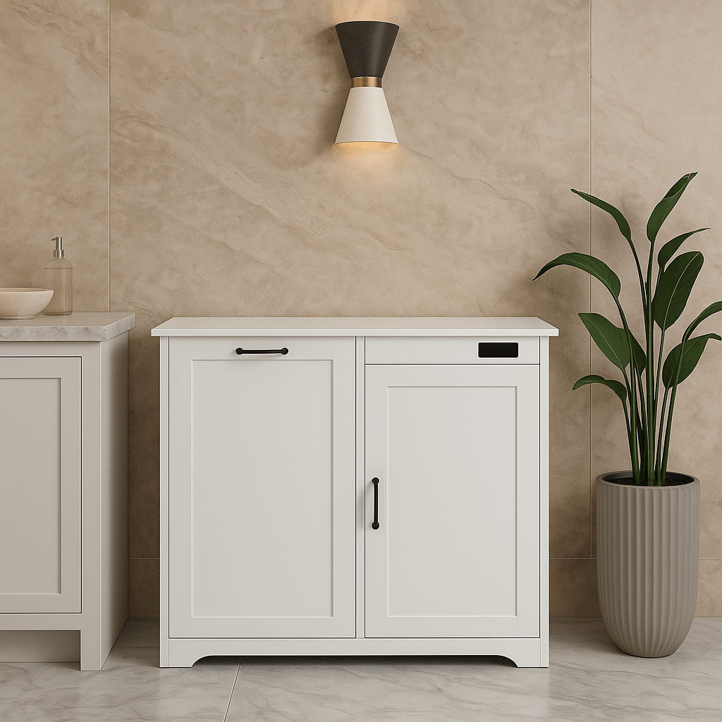 The Numhew Trash Can Cabinet is a masterpiece of design and utility, seamlessly blending into modern kitchens. Its tilt-out doors and sleek white finish create a clean, organized aesthetic, while the smart deodorizer device ensures freshness. Pair it with minimalist decor for a harmonious look, making it an essential piece for a sophisticated and functional kitchen.