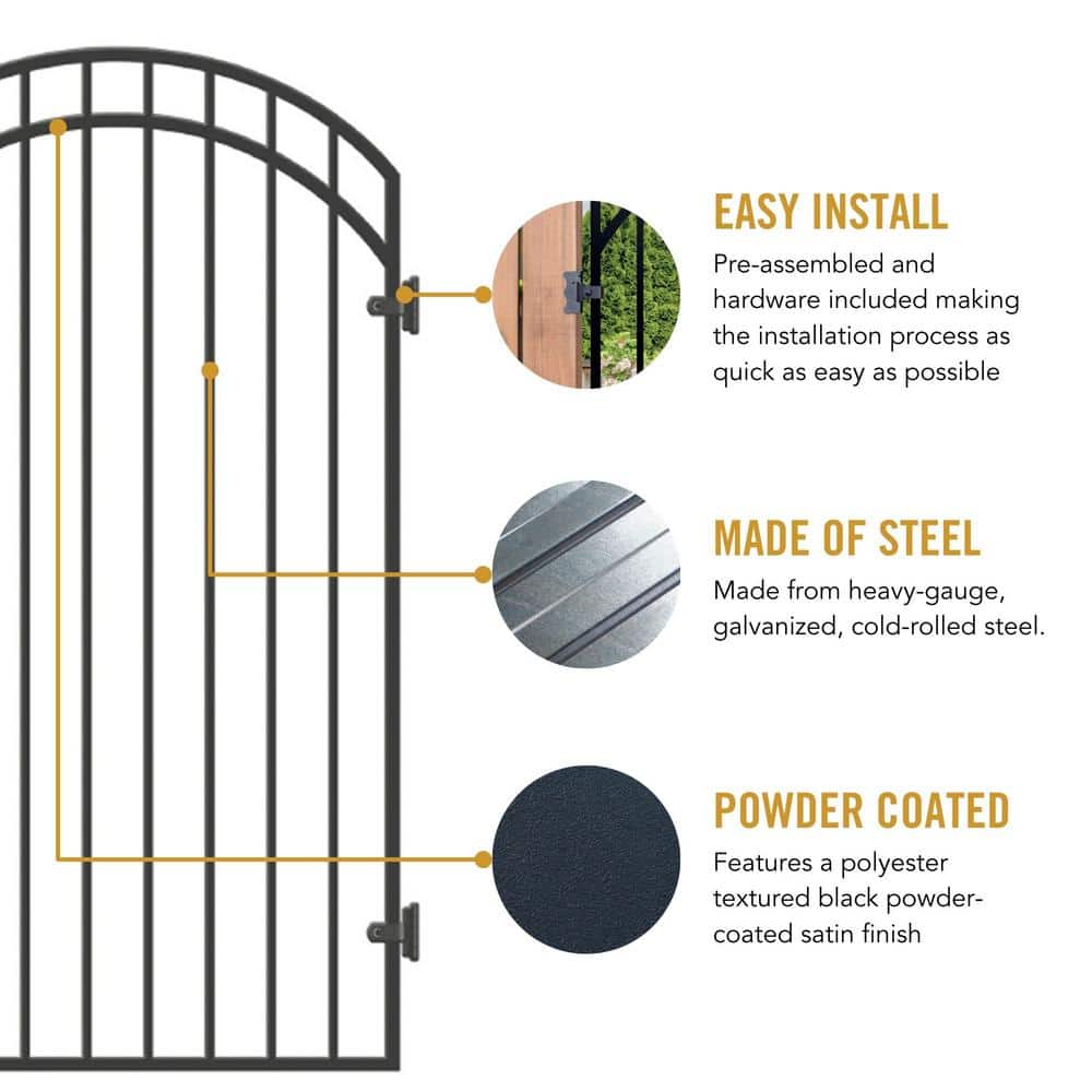 Enhance your outdoor space with the NUVO IRON 33 in. x 68 in. Garnet Gate Door. Boasting a sophisticated black arched design, this gate combines modern aesthetics with reliable functionality, made from durable galvanized steel for lasting beauty and strength.