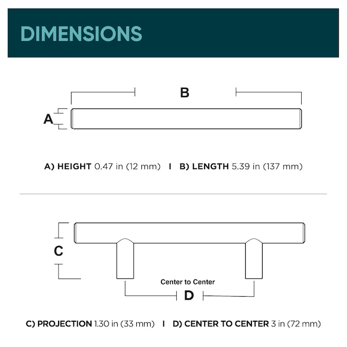 A: The Axel Bar Pull has a length of 5.39 inches, a width of 1.3 inches, and a projection of 1.3 inches with a 3-inch center to center mounting.