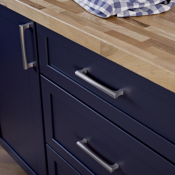 Transform your cabinetry with the elegant and enduring Karena Satin Nickel Drawer Pull—order today to start your home's stylish update.
