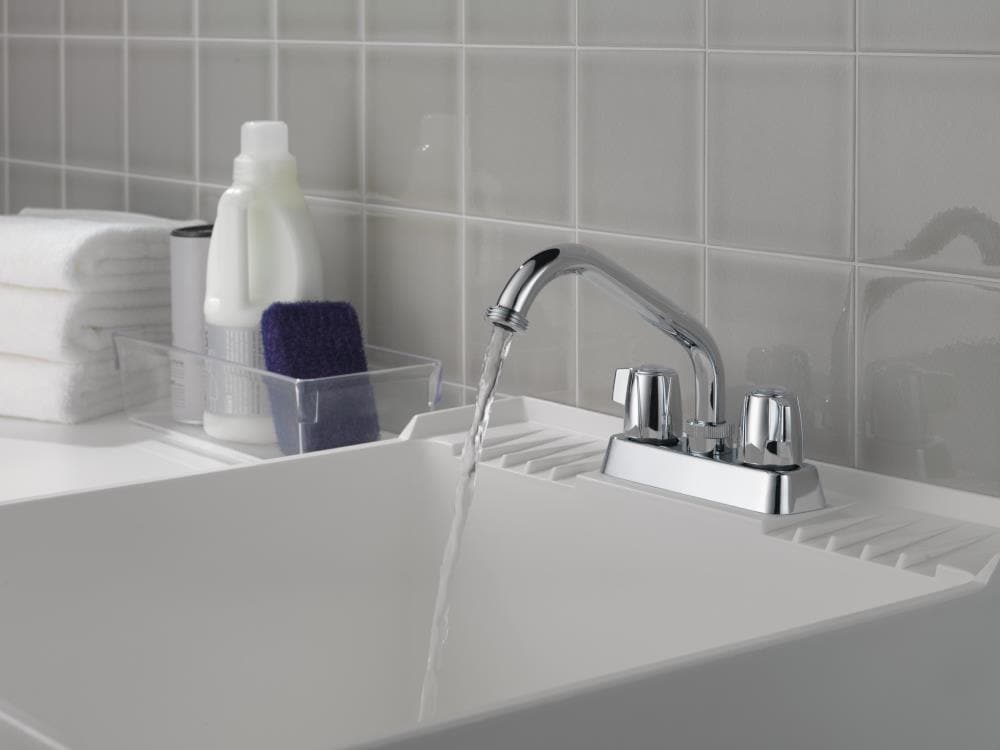 Transform your utility space with the Peerless Chrome 2-Handle Deck-Mount Utility Faucet, a blend of form and function. Its reflective chrome finish and clean lines exude sophistication, pairing effortlessly with modern and traditional decors. Picture a bright laundry room where functionality meets style, the gleaming faucet serving as a focal point. An essential for any upscale home, it harnesses design and practicality to enhance every day.