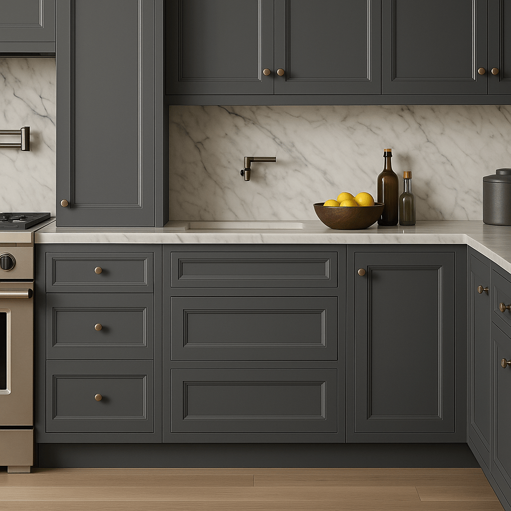 The Keyport Shaker Drawer Base Kitchen Cabinet by PELHAM & WHITE combines modern style with functionality. Featuring durable plywood construction and a premium charcoal painted finish, this cabinet is easy to assemble with pre-installed hardware and soft-close drawers.