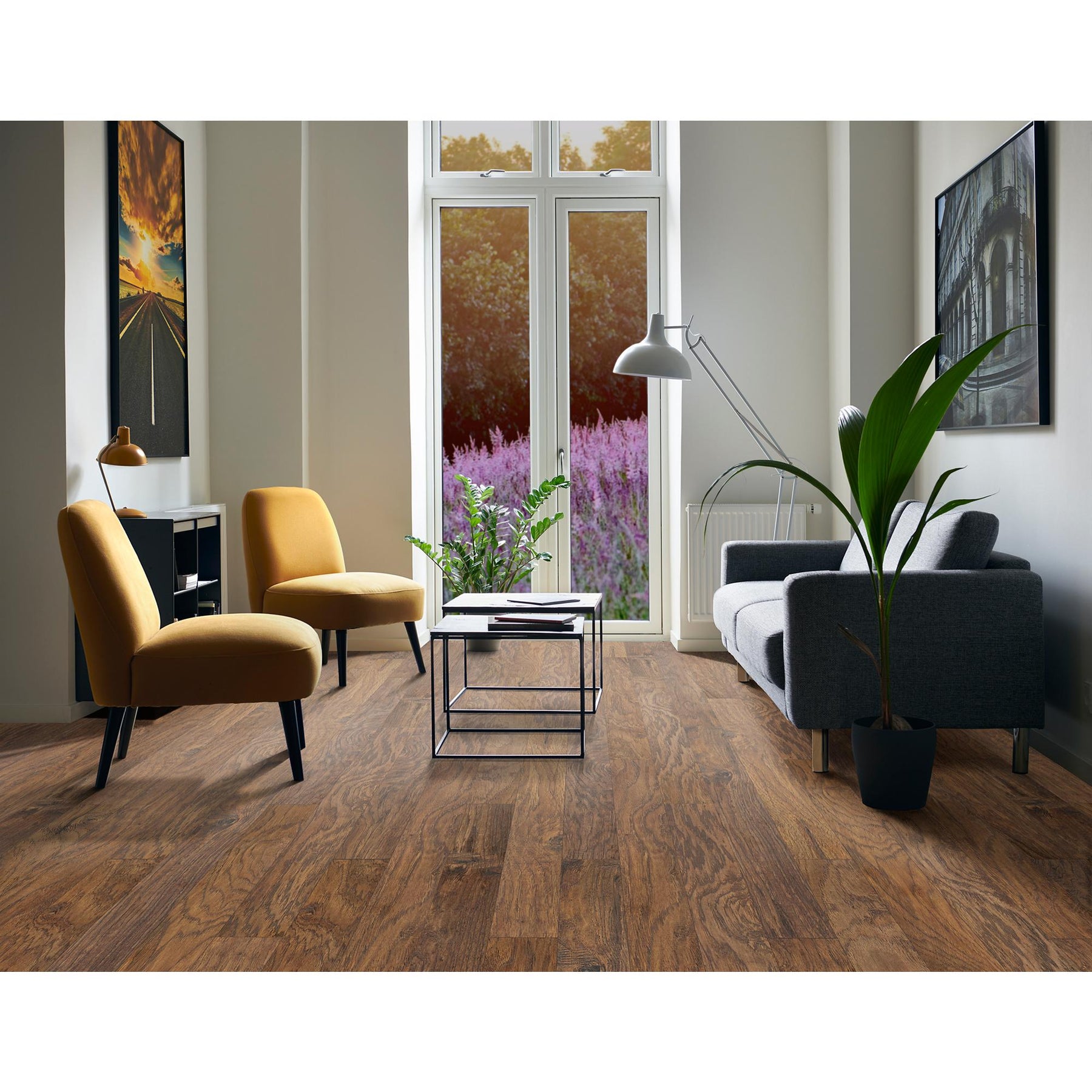 The Pergo Lowland Hickory laminate sizzles with rustic charm, transforming your home into a warm, inviting sanctuary. Its distressed, handscraped finish adds an artisanal touch, reminiscent of timeless craftsmanship. Consider pairing it with cozy, neutral-toned furnishings for a harmonious setting that whispers sophistication. This laminate flooring not only elevates style but contributes to a luxurious living experience with its robust and adaptable design.