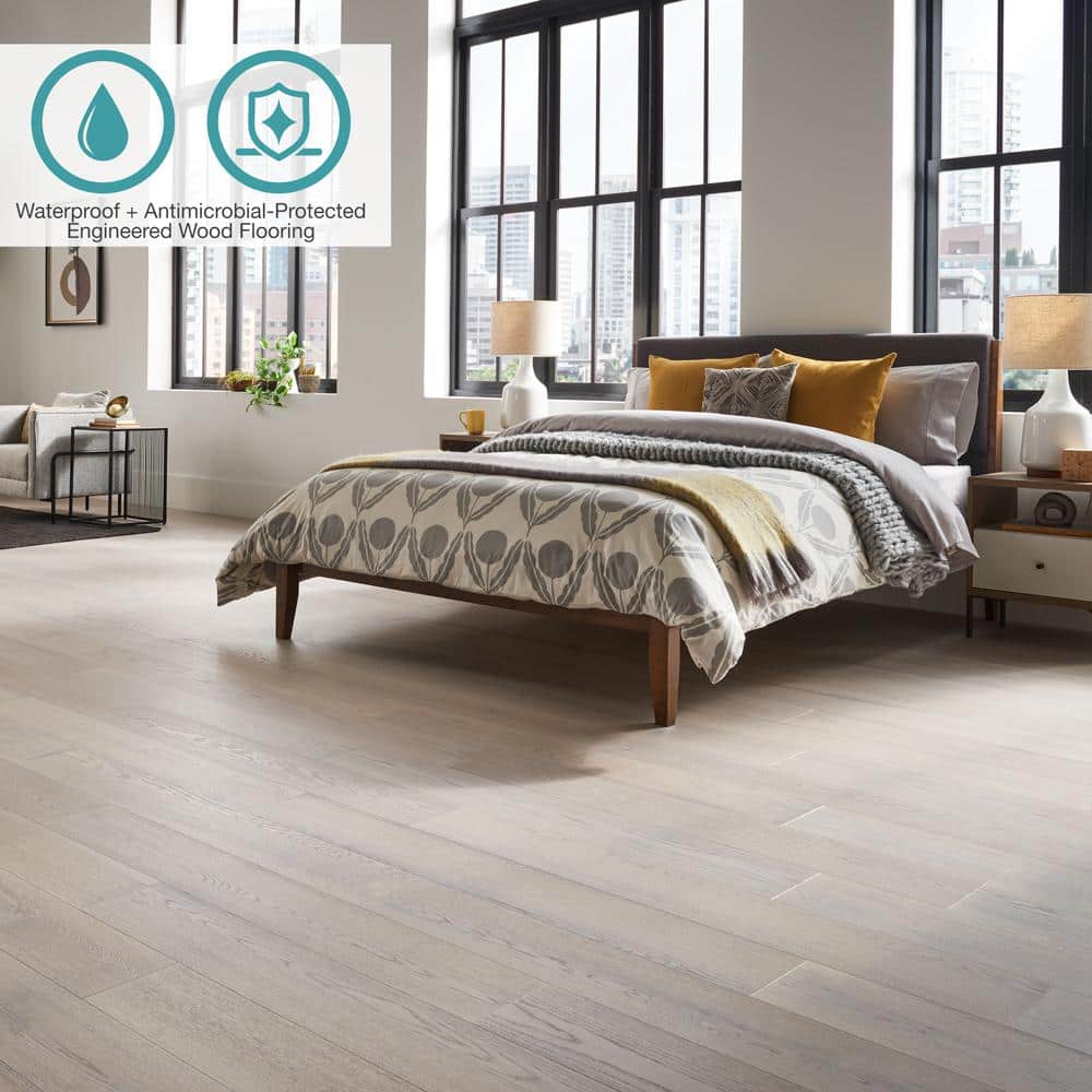 Enhance your space with the Pergo Defense+ Claremore Bay Oak Engineered Hardwood Flooring, offering a stunning blend of creamy white tones and soft grey graining in a matte wire-brushed finish. This flooring not only transforms interiors with its sophisticated look but also features antimicrobial protection and waterproof technology, ensuring durability and hygiene in high-traffic areas. Ideal for both residential and commercial projects, its easy click-lock installation makes it a favorite for both pros and DIY enthusiasts.