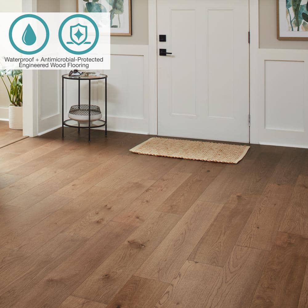 Step up your flooring game with Pergo Defense+ Hadlock Harbor Oak Engineered Hardwood. This waterproof and antimicrobial flooring offers a stunning wirebrushed satin finish, providing superior scratch and stain resistance. Designed for easy installation, its click-lock technology ensures a secure fit, making it perfect for both residential and light commercial spaces.