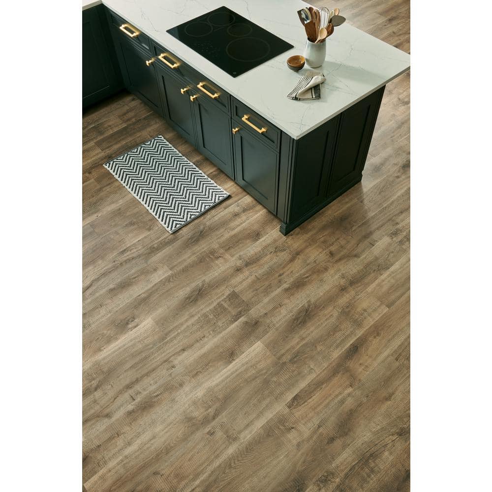 The Pergo Defense+ Tanned Chester Oak flooring is an embodiment of sophistication and durability, transforming any room into a haven of style and comfort. Its lifelike oak finish, with rich brown tones mingled with subtle greys, offers an elegant foundation for introspective repose or convivial gatherings. Style it in your sunroom with plush, cream-colored seating to maximize natural light, creating a serene yet sumptuous retreat. This flooring isn't just a surface—it's the canvas for your most luxurious living experiences.