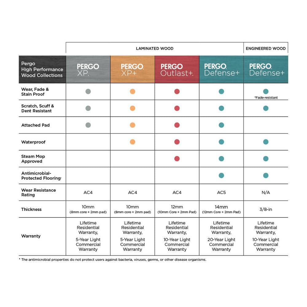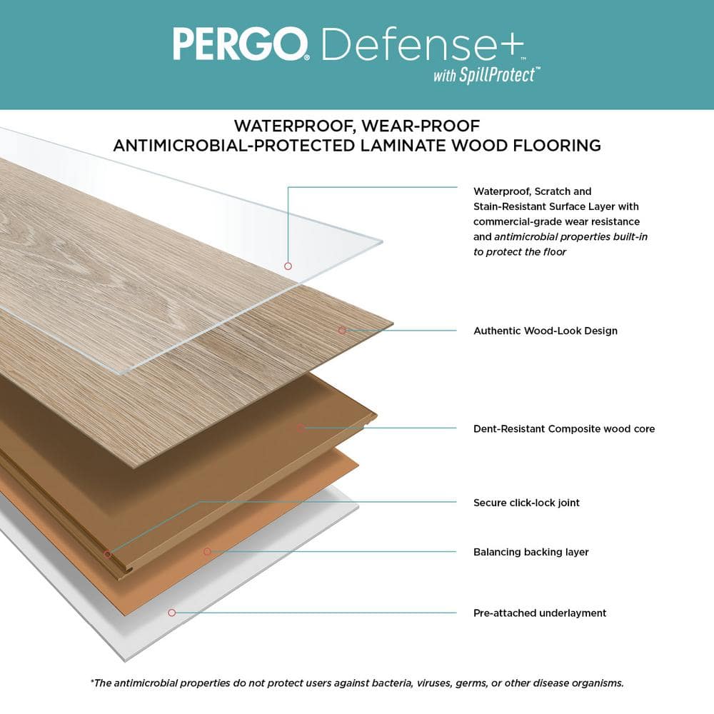 The Pergo Defense+ Tanned Chester Oak is a waterproof, antimicrobial laminate wood flooring that combines durability with effortless style. With its authentic wood grain texture and superior dent-and-scratch resistance, it’s designed to handle commercial-grade wear while still being perfect for your home. Easy installation is ensured with attached underlayment, while SpillProtect keeps your floors pristine, preventing spills from causing damage.