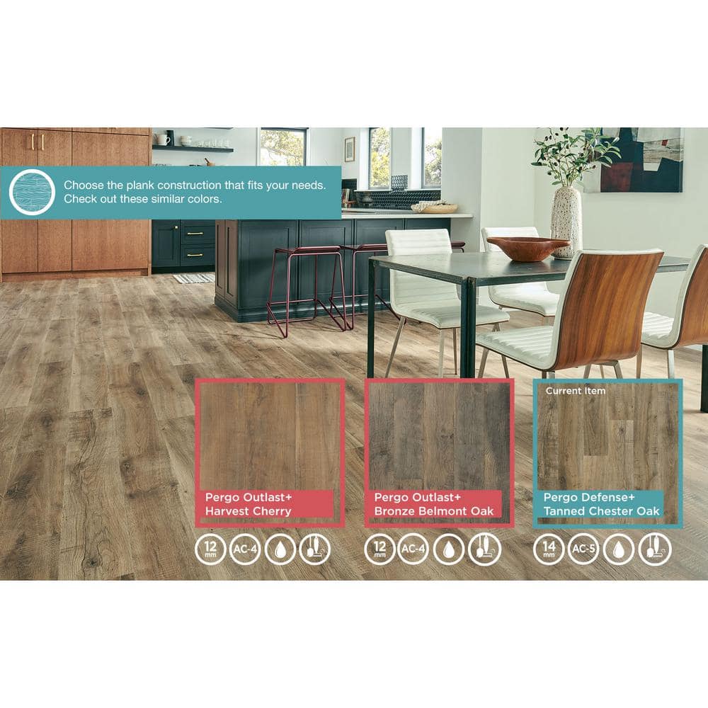 Transform your living space with Pergo Defense+ Tanned Chester Oak Flooring today—install sophistication and durability effortlessly.