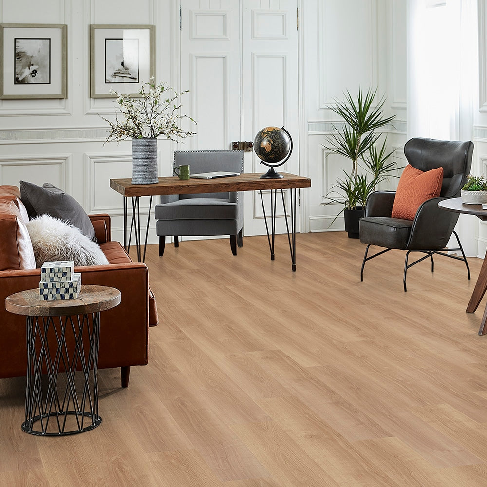 Imagine walking into a space transformed by the elegance of Pergo DuraCraft's Lisbon Brown Vinyl Plank. This flooring artfully combines the rich texture of wood with sophisticated sandy hues, effortlessly adding warmth and authenticity to any room. Pair with soft textiles and chic metallics to enhance the rich undertones of its grain. It's not just a floor, it's essential for creating a luxe yet livable environment that's both stunning and practical.