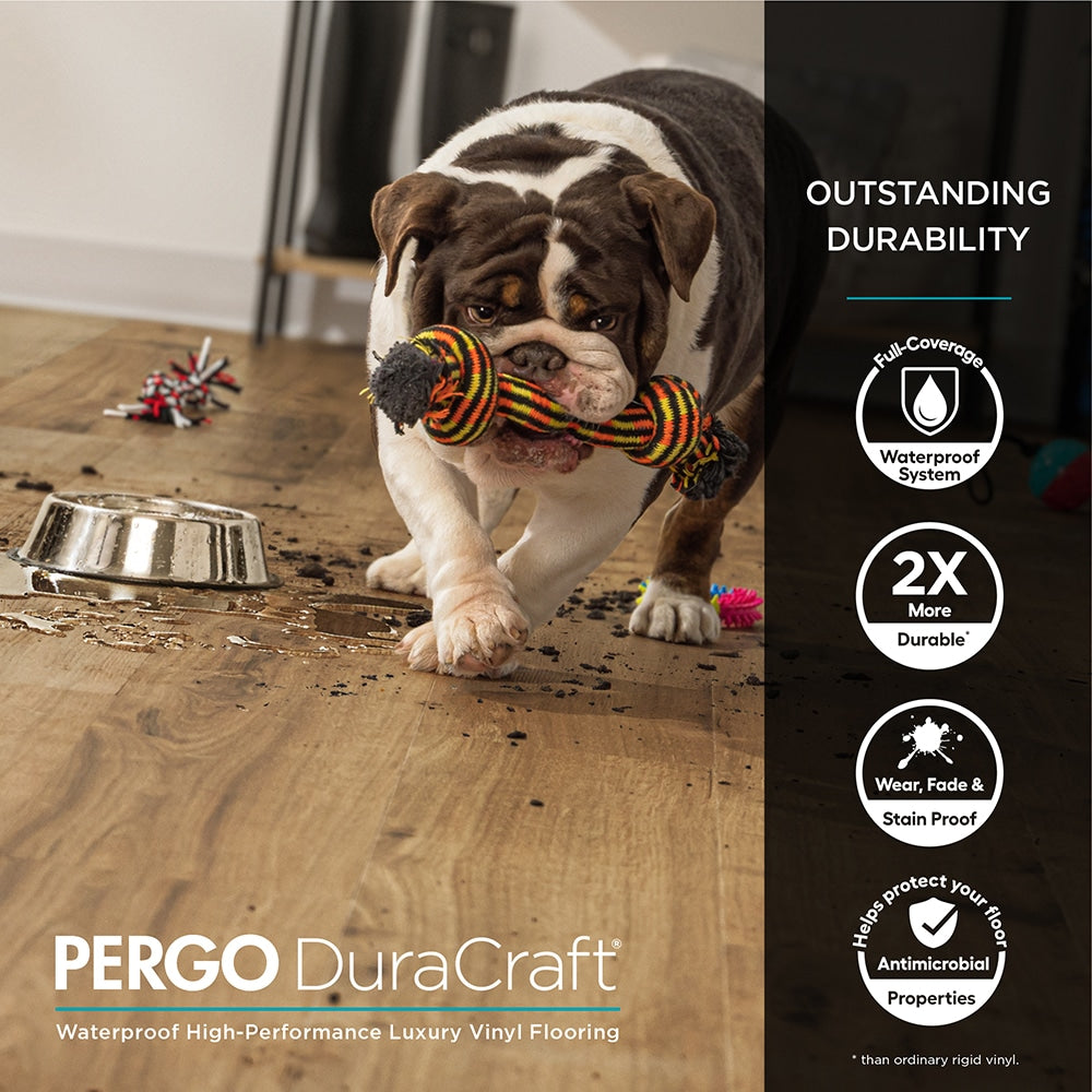 Elevate your space with Pergo's DuraCraft Paris Oak luxury vinyl plank. Engineered to offer a water-resistant, durable, and authentic wood look, it harnesses the power of WetProtect® and TruView™ technologies for a flawless floor. Featuring a timeless oak design, it's perfect for high-moisture areas, providing beauty and resilience where you need it most.
