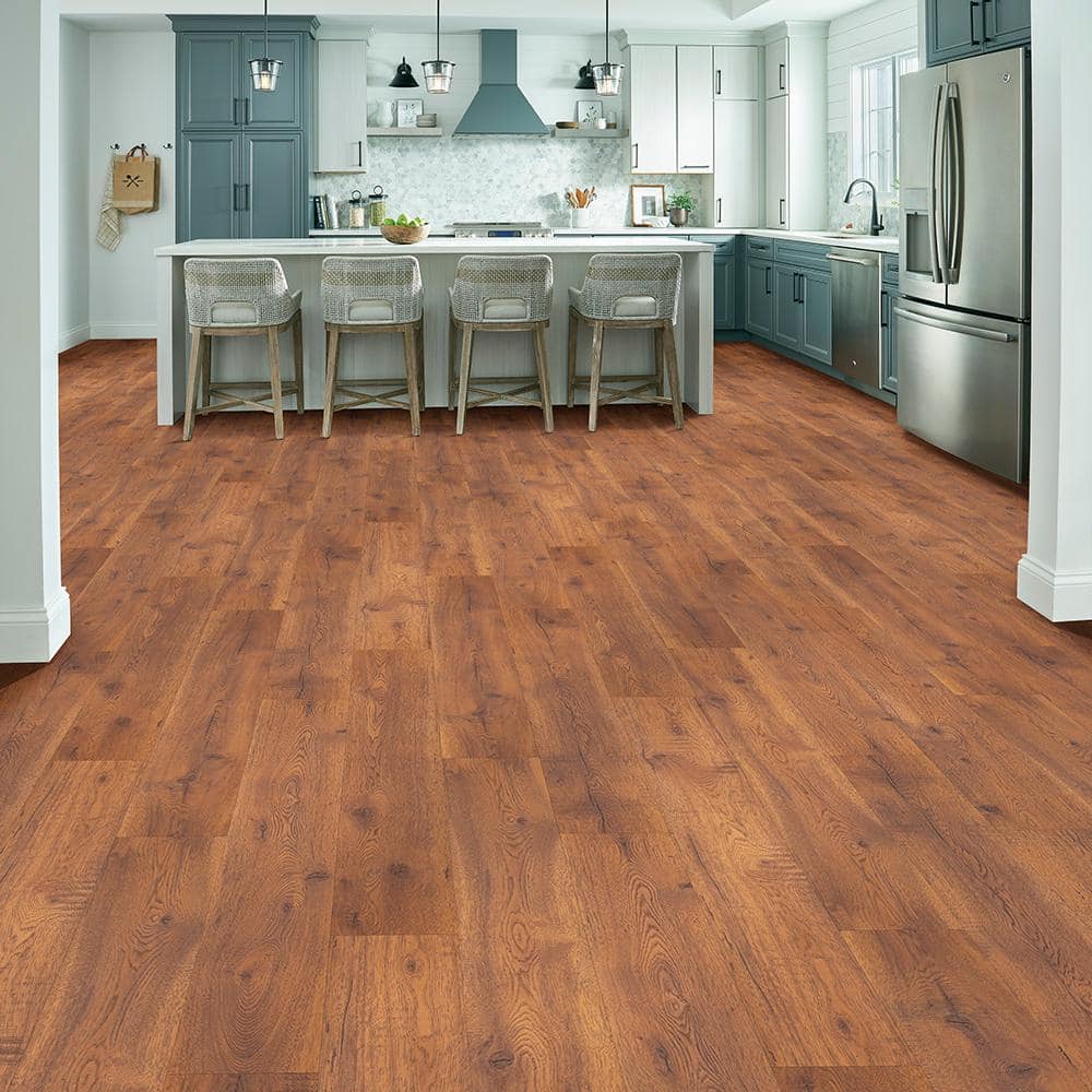 Imagine stepping into a room adorned with the rich, amber hues of Hobbs Amber Hickory laminate flooring. The subtle wirebrushed texture not only adds depth and sophistication to any space but also hints at a history of artisanal craftsmanship. Style it with a lovely set of contemporary furniture and plush rugs to enhance its luxurious look. This flooring not only complements a modern aesthetic but also becomes a foundation for creating your dream interior, truly making it an essential for any opulent home.