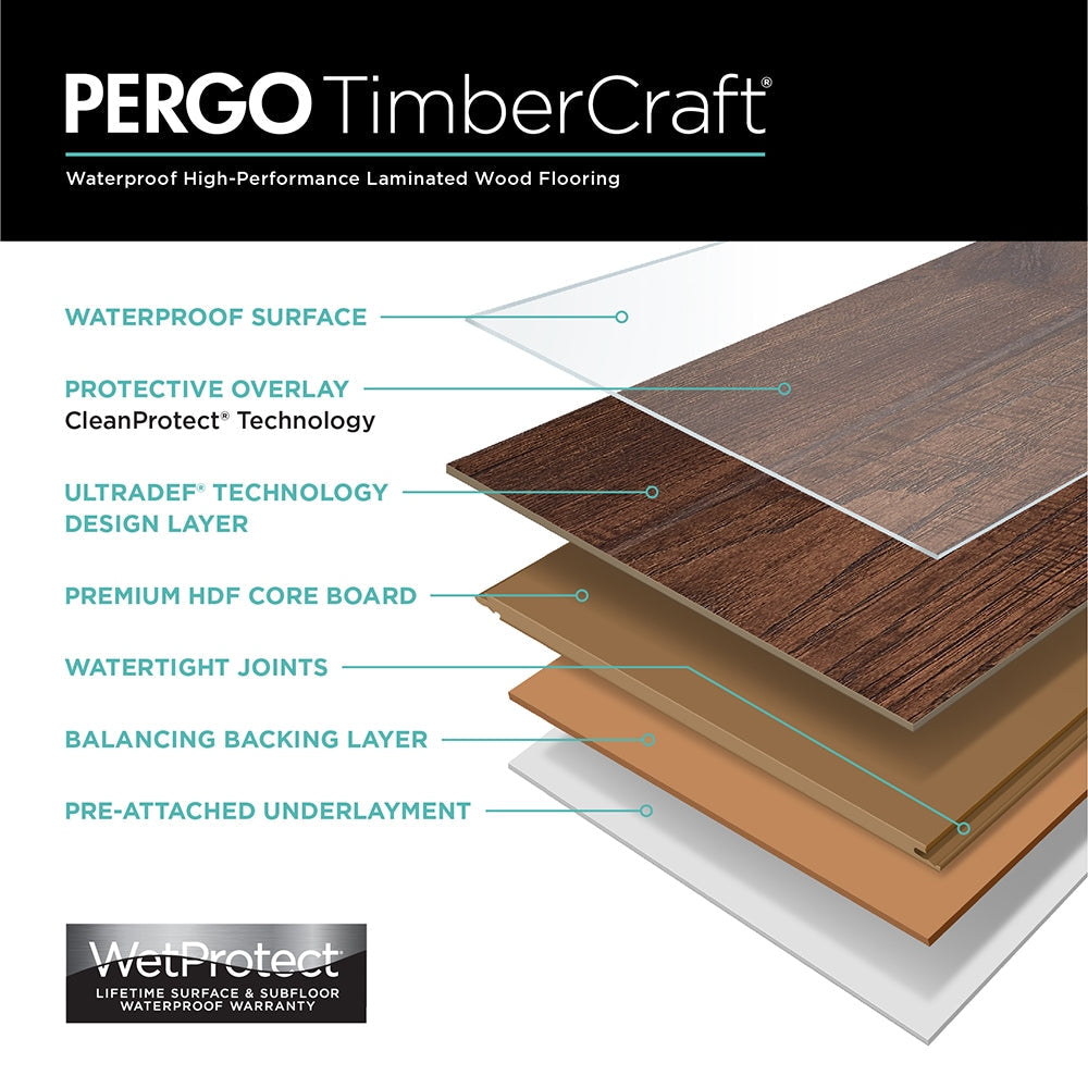 Enhance your space with the Pergo TimberCraft Chester Ridge Hickory laminate flooring, featuring WetProtect technology for lifetime waterproof protection. This flooring combines the beauty of real wood with Pergo's innovative durability, making it perfect for high-moisture areas and providing superior scratch-resistance for a lasting finish.