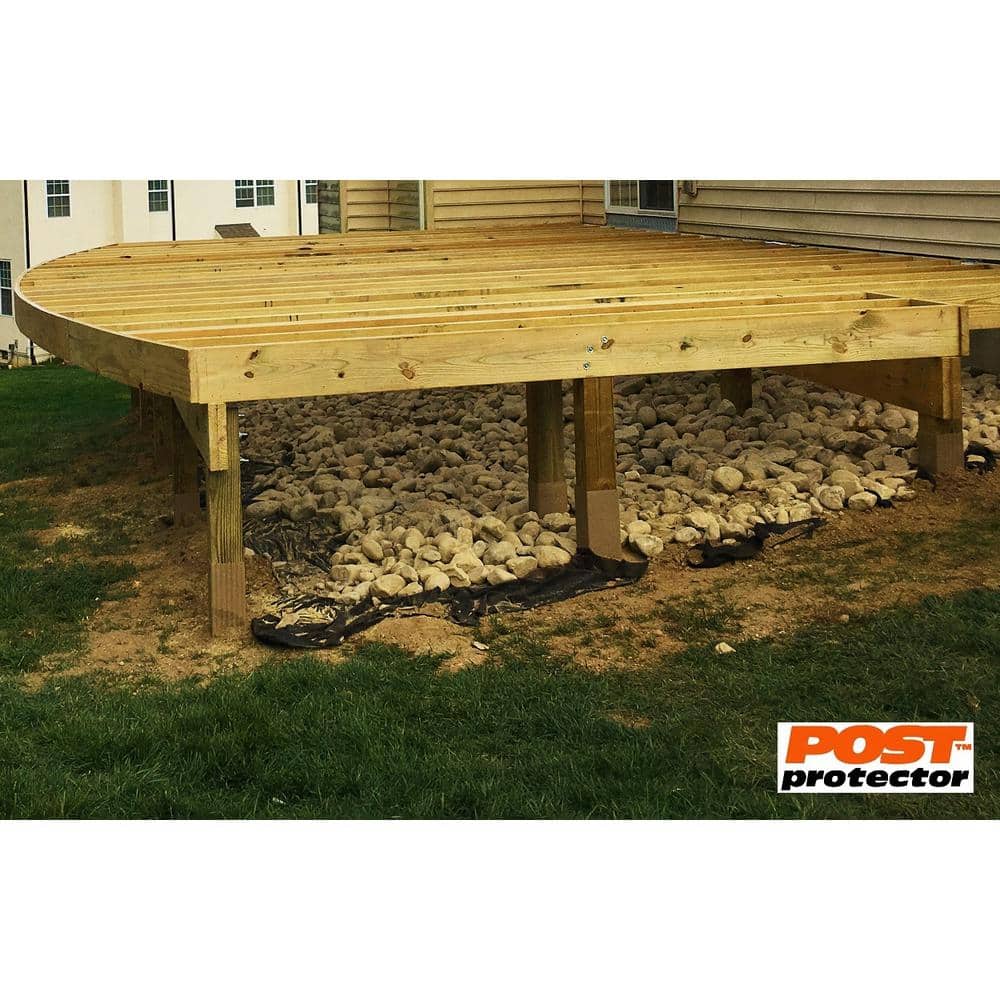 A: The Post Protector acts as a physical barrier that prevents soil-dwelling fungi and insects from accessing the wood, thus protecting against decay without relying solely on chemical preservatives.