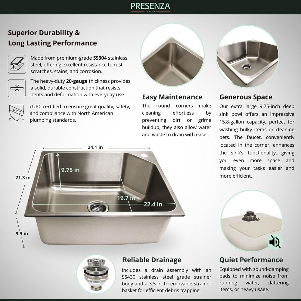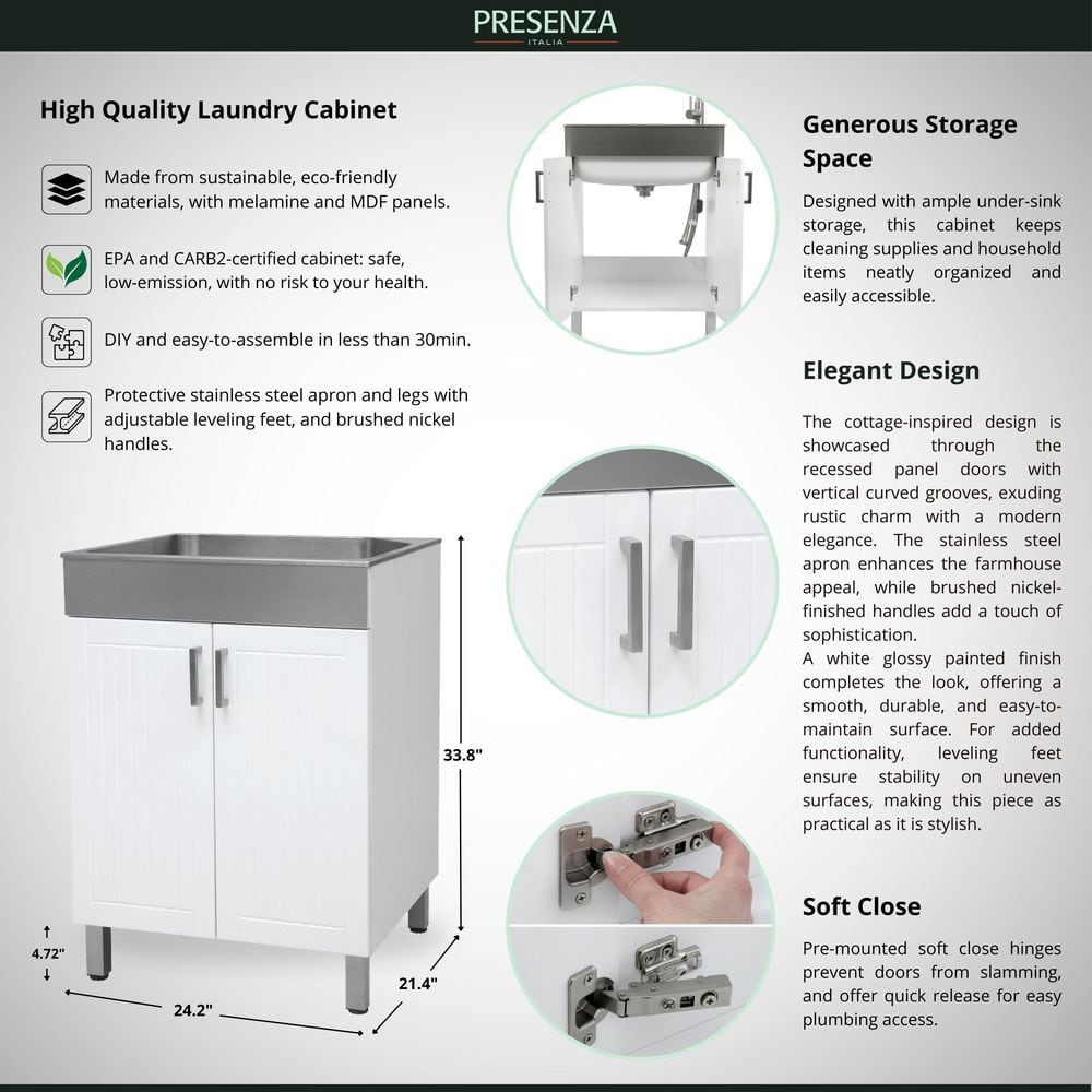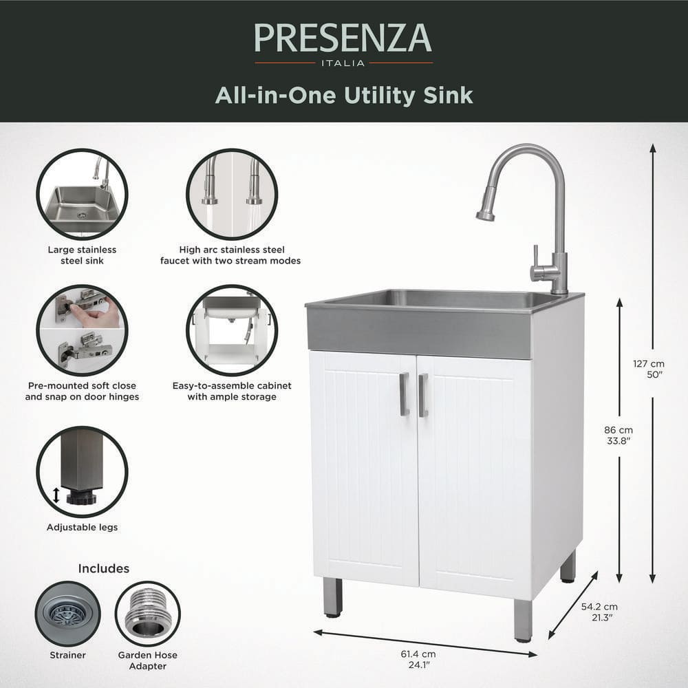 Elevate your utility or laundry room with the Presenza All-in-One Utility Sink Cabinet. Featuring a durable 9.75-inch deep stainless steel sink and a spacious cabinet with soft-close doors, this sink provides both functionality and style. Perfect for garages or storage rooms, it comes with a stainless steel faucet that's garden hose compatible.