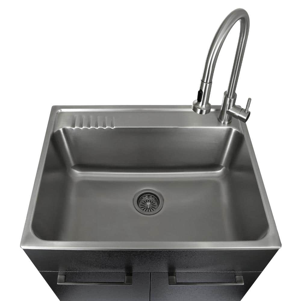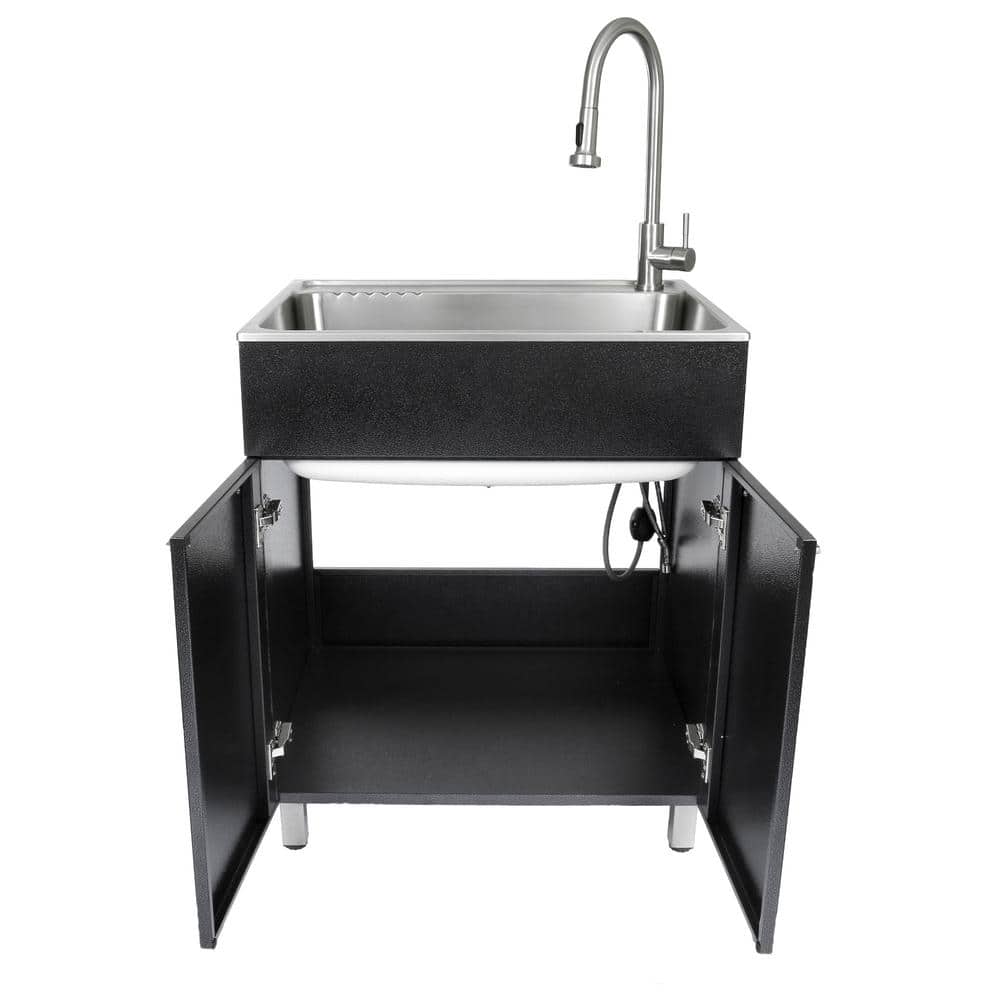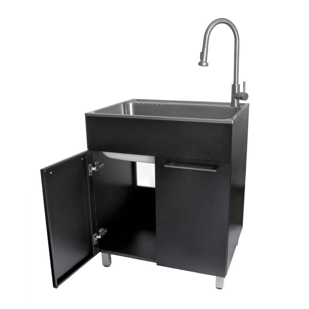 Elevate your utility space with the Presenza Stainless Steel Laundry Sink and Cabinet. This all-in-one solution boasts a deep 9.75-inch stainless-steel sink that handles a wide range of cleaning tasks, complemented by a spacious cabinet. With corrosion-resistant properties, soft-close doors, and a sleek black finish, it provides both functionality and style for garages and laundry rooms.