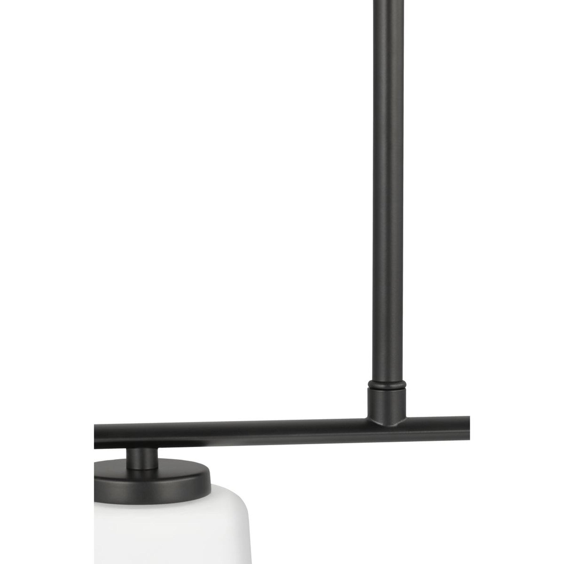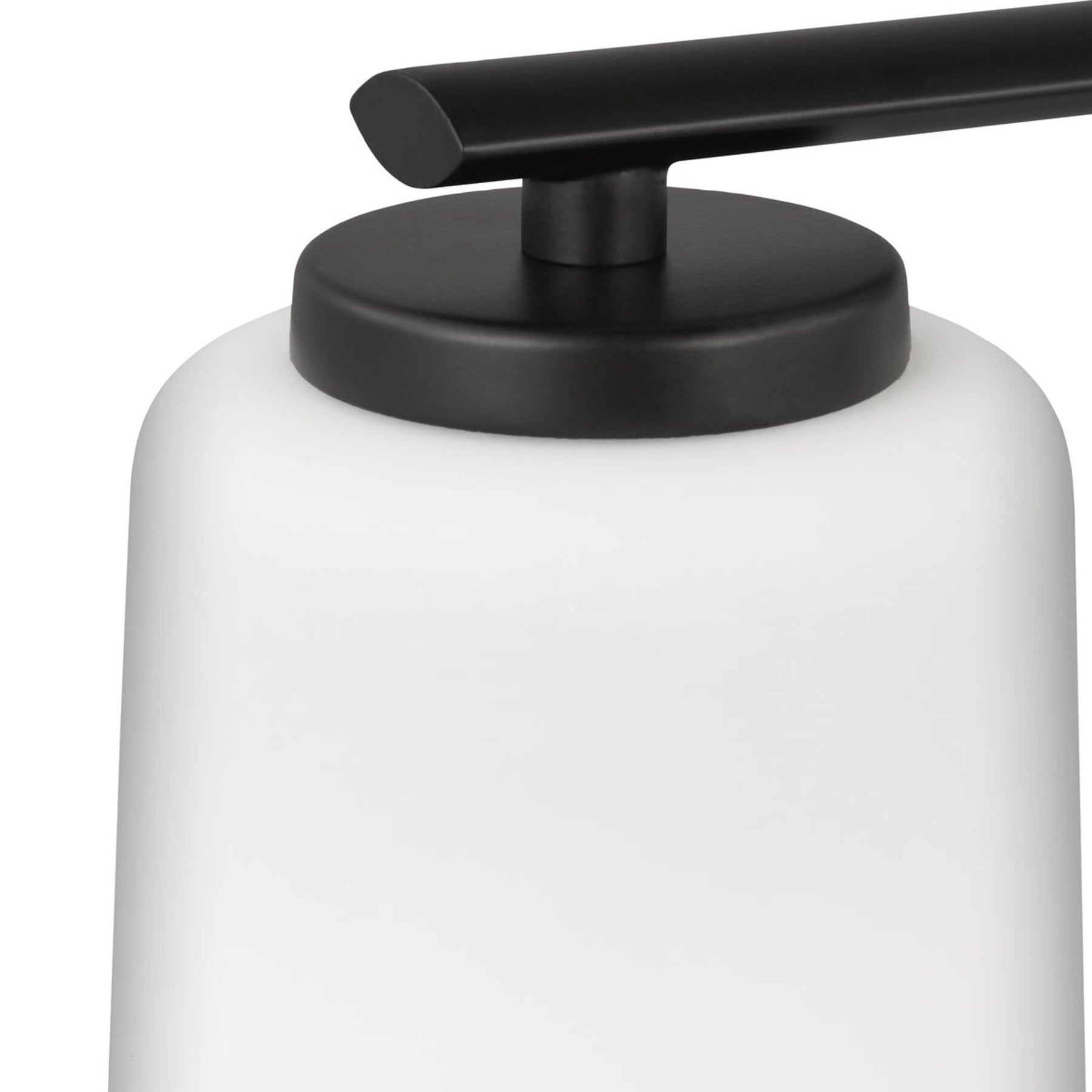 • Design: Features a mix of modern and traditional elements, with etched white glass shades and a matte black finish.