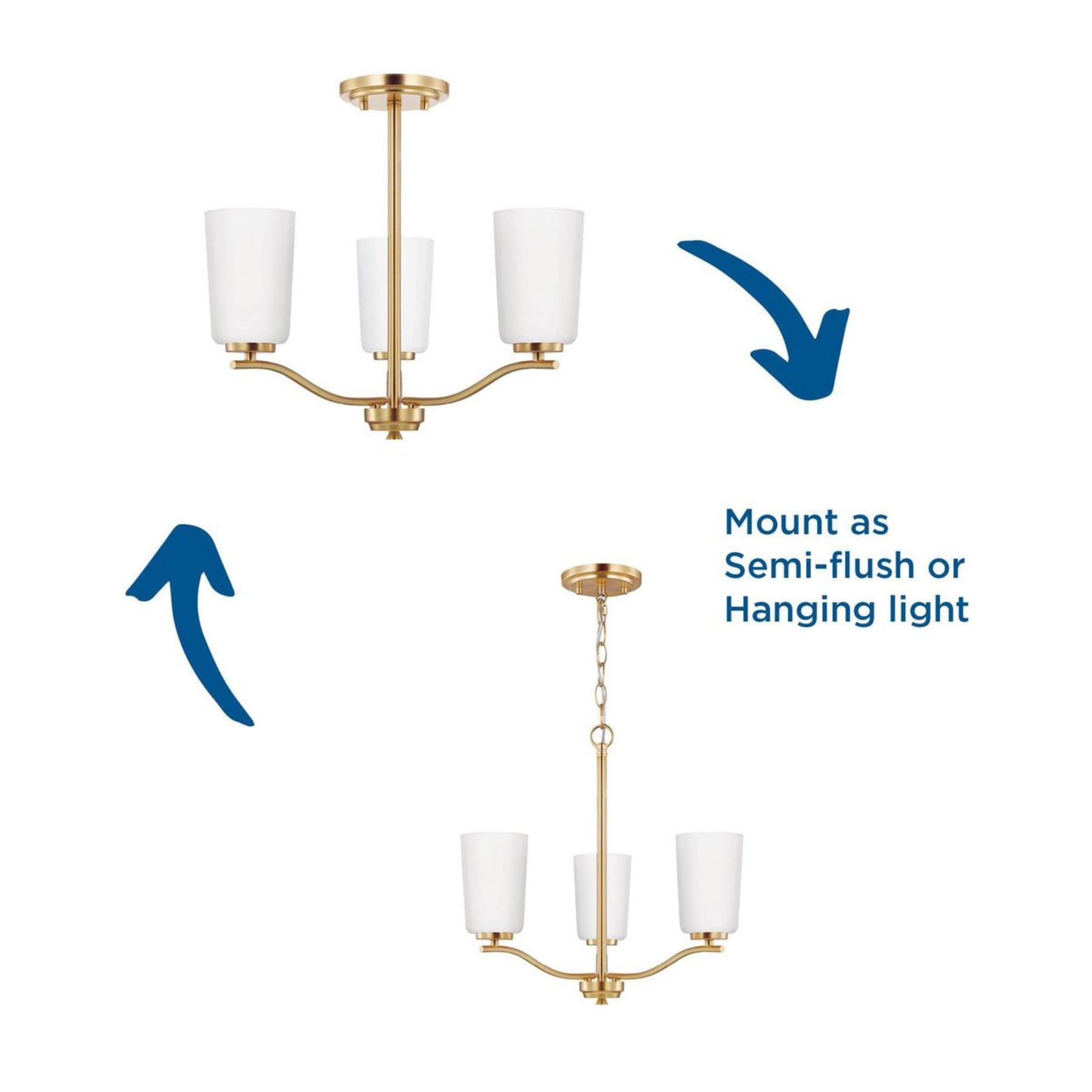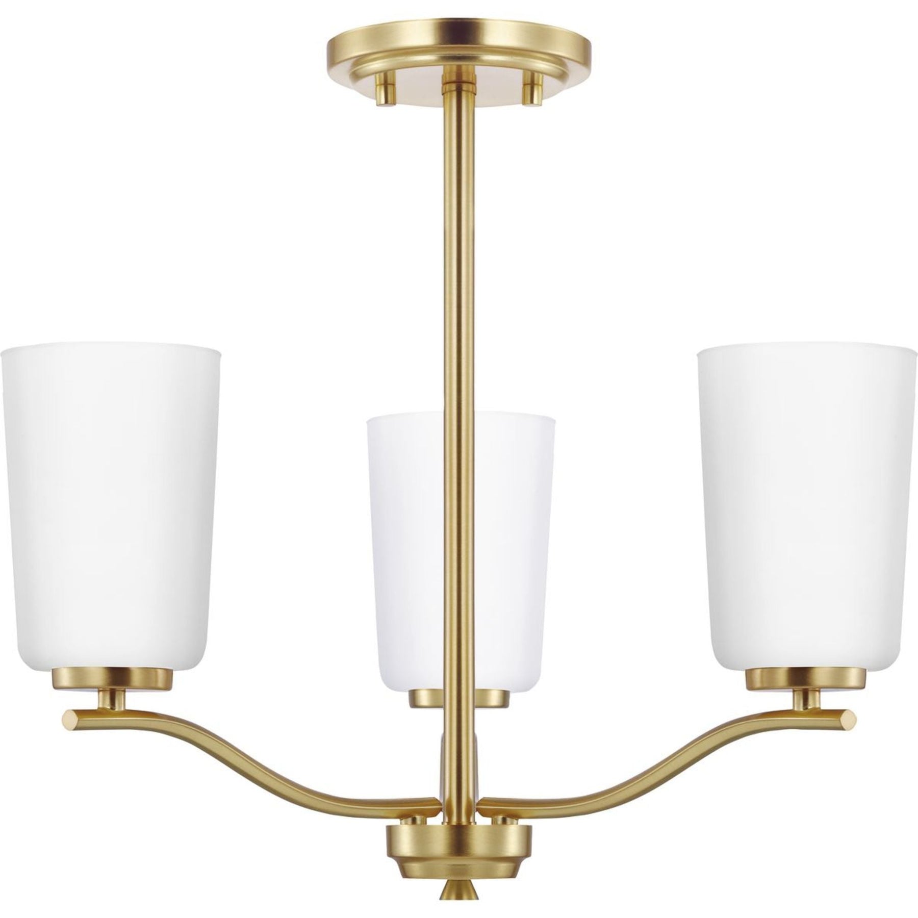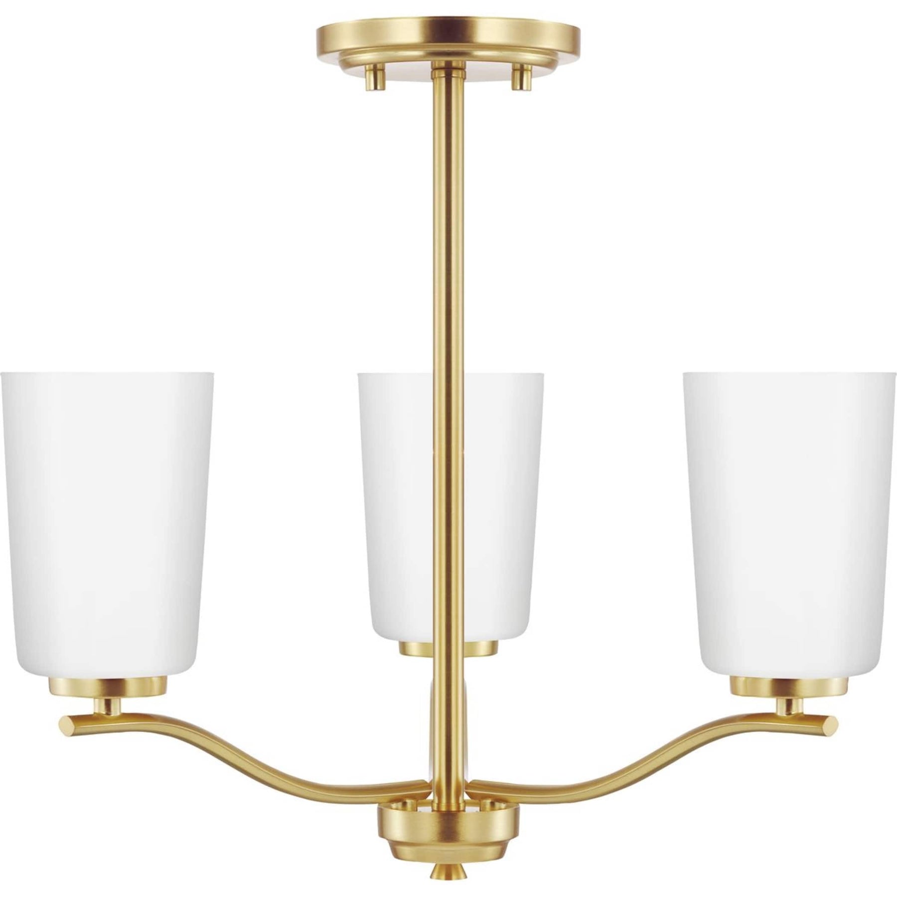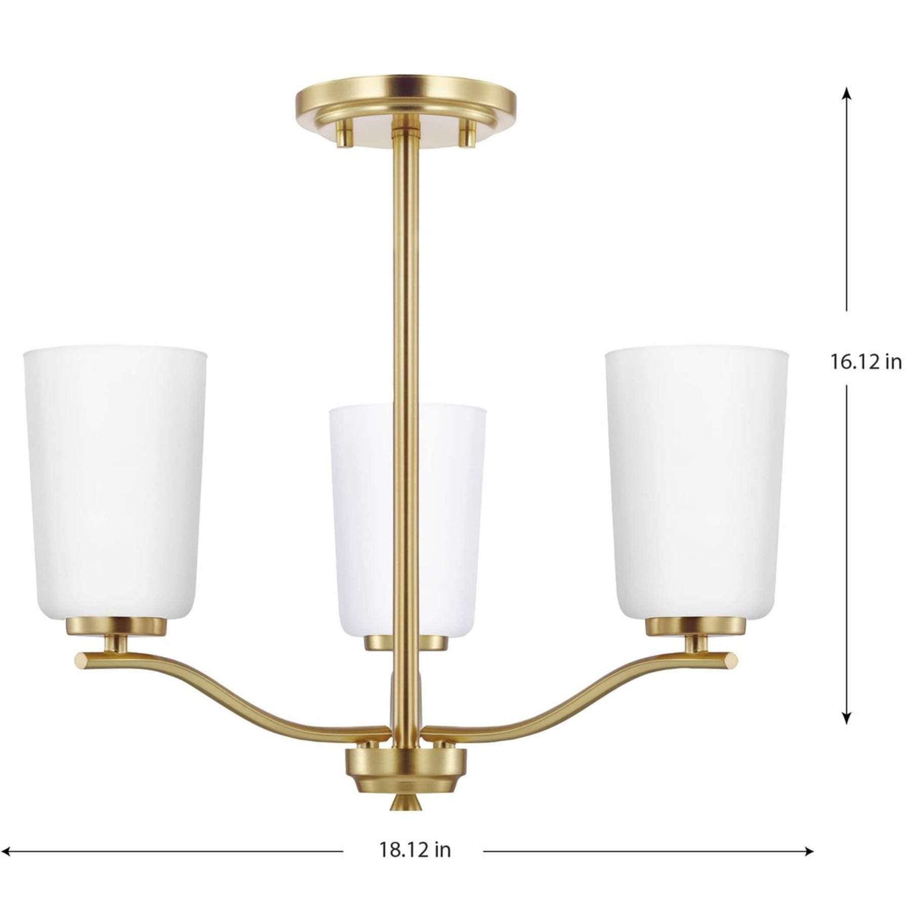 • Elegant Design: Features a satin brass finish with etched white glass shades, suited for transitional spaces.