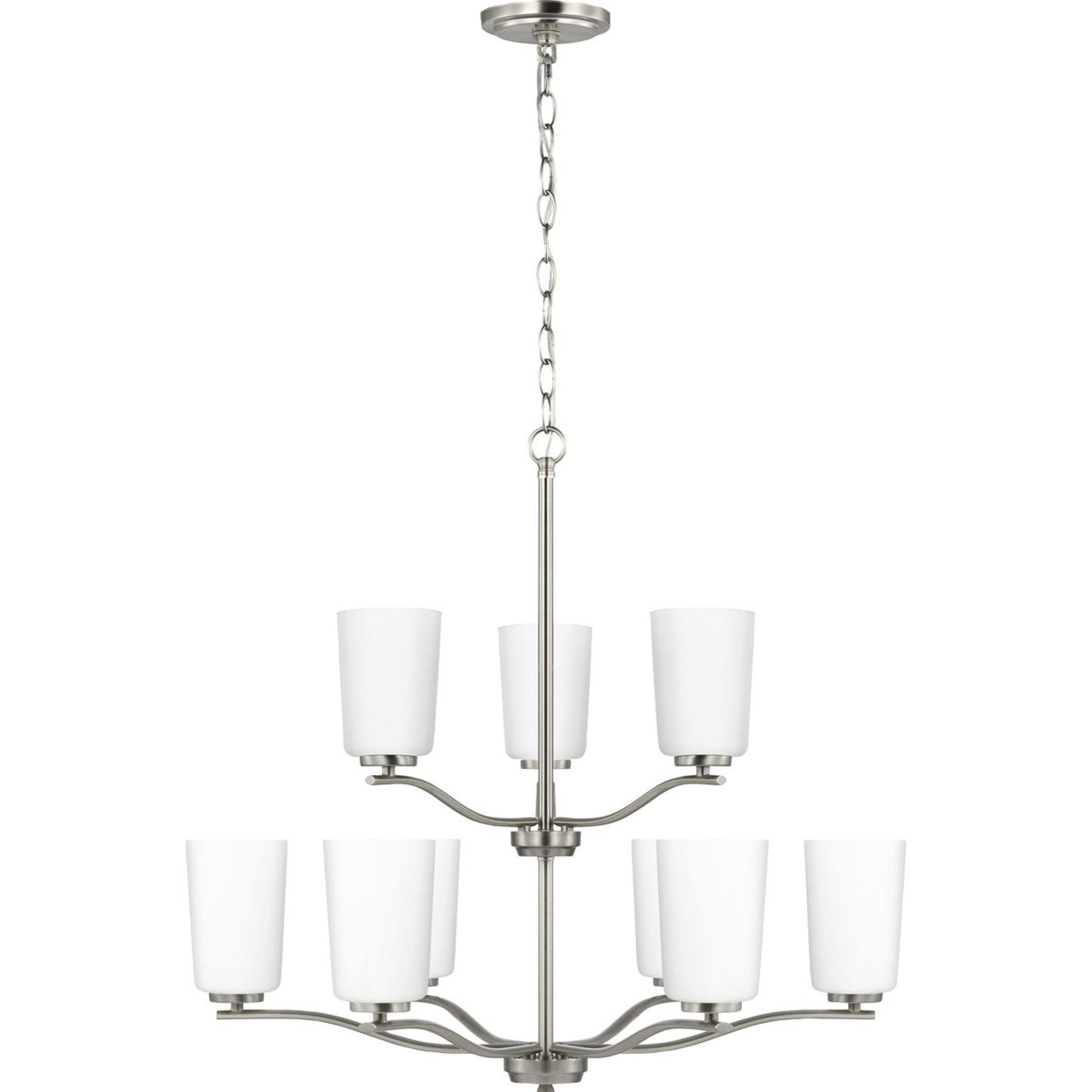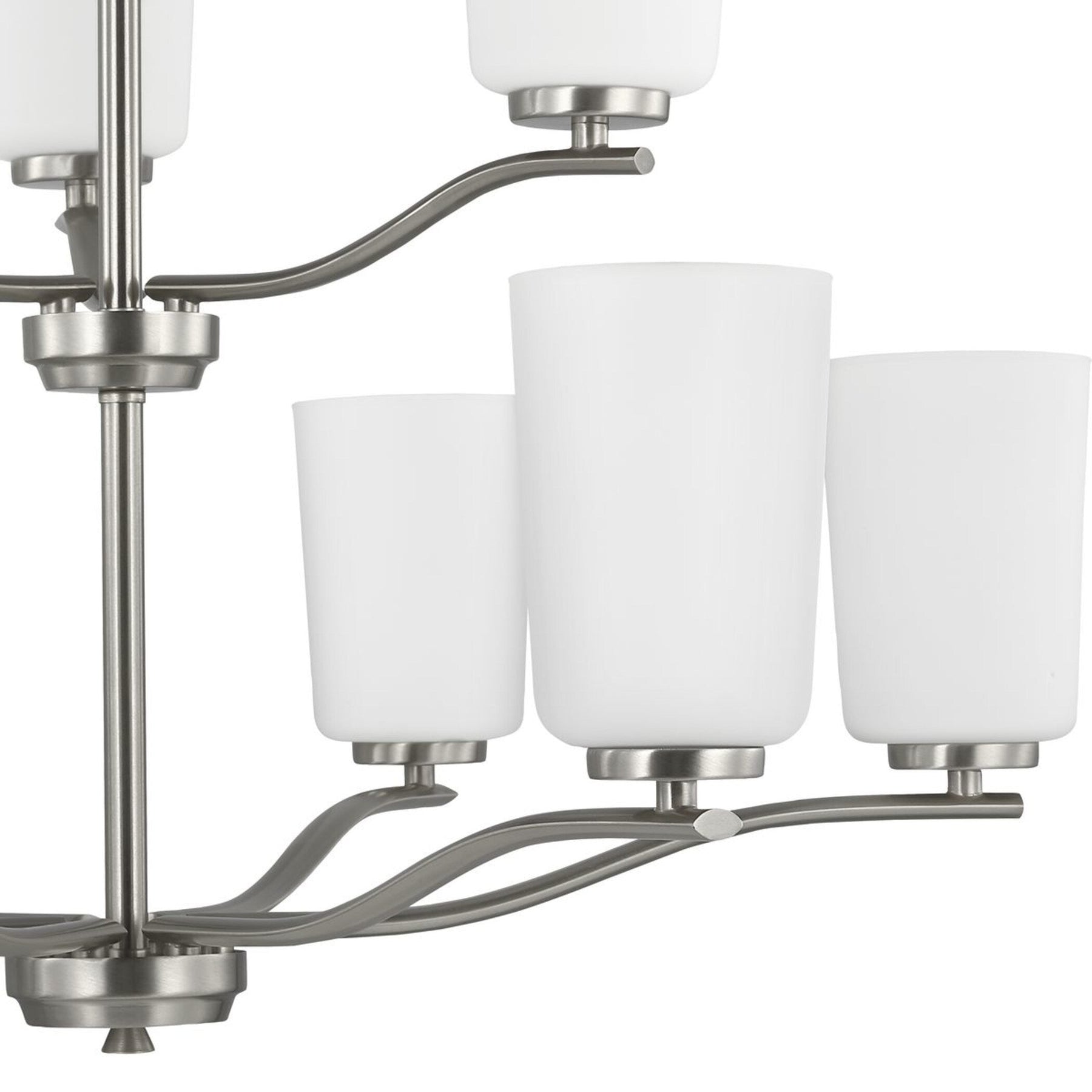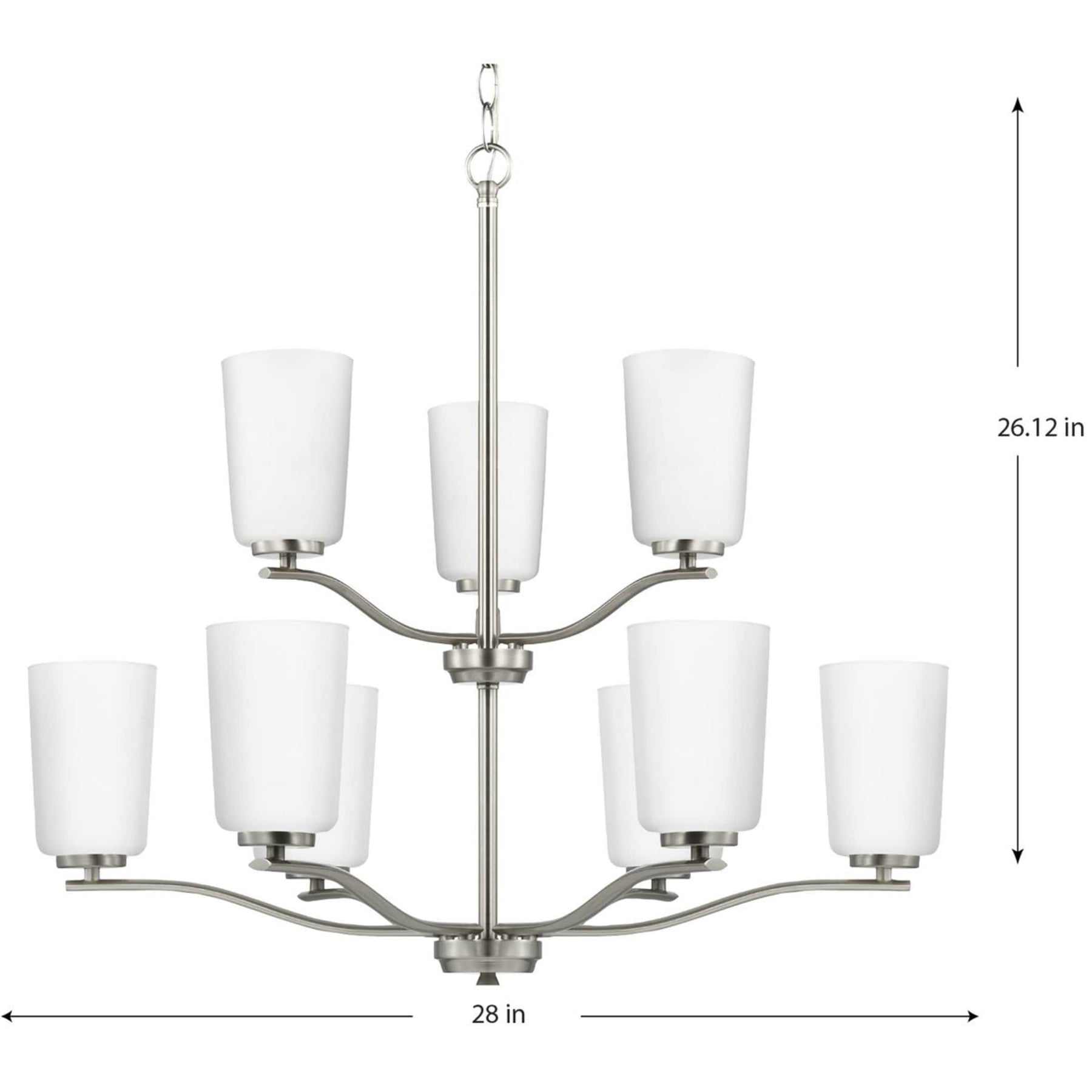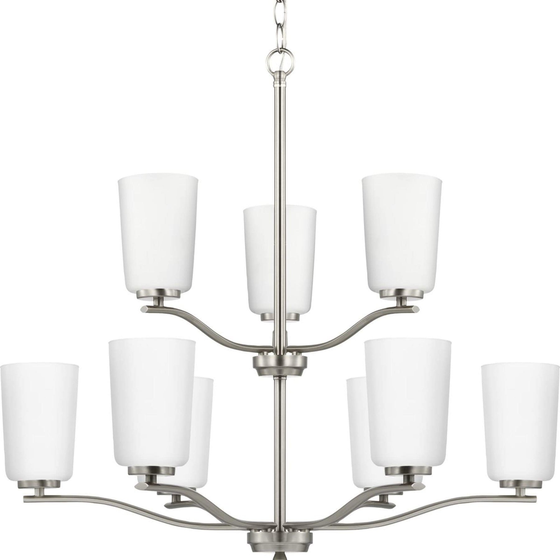 The Adley 9-Light Transitional Chandelier by Progress Lighting elegantly marries modern and traditional design elements, making it a versatile choice for any contemporary or transitional space. Its brushed nickel finish and etched white glass shades exude sophistication, while the chandelier's two-tier design ensures ample illumination. Designed for easy installation, this fixture is sure to enhance any dining room, living area, or grand foyer.