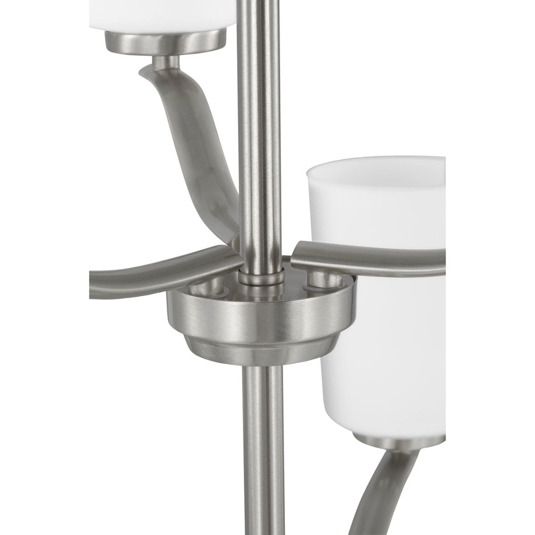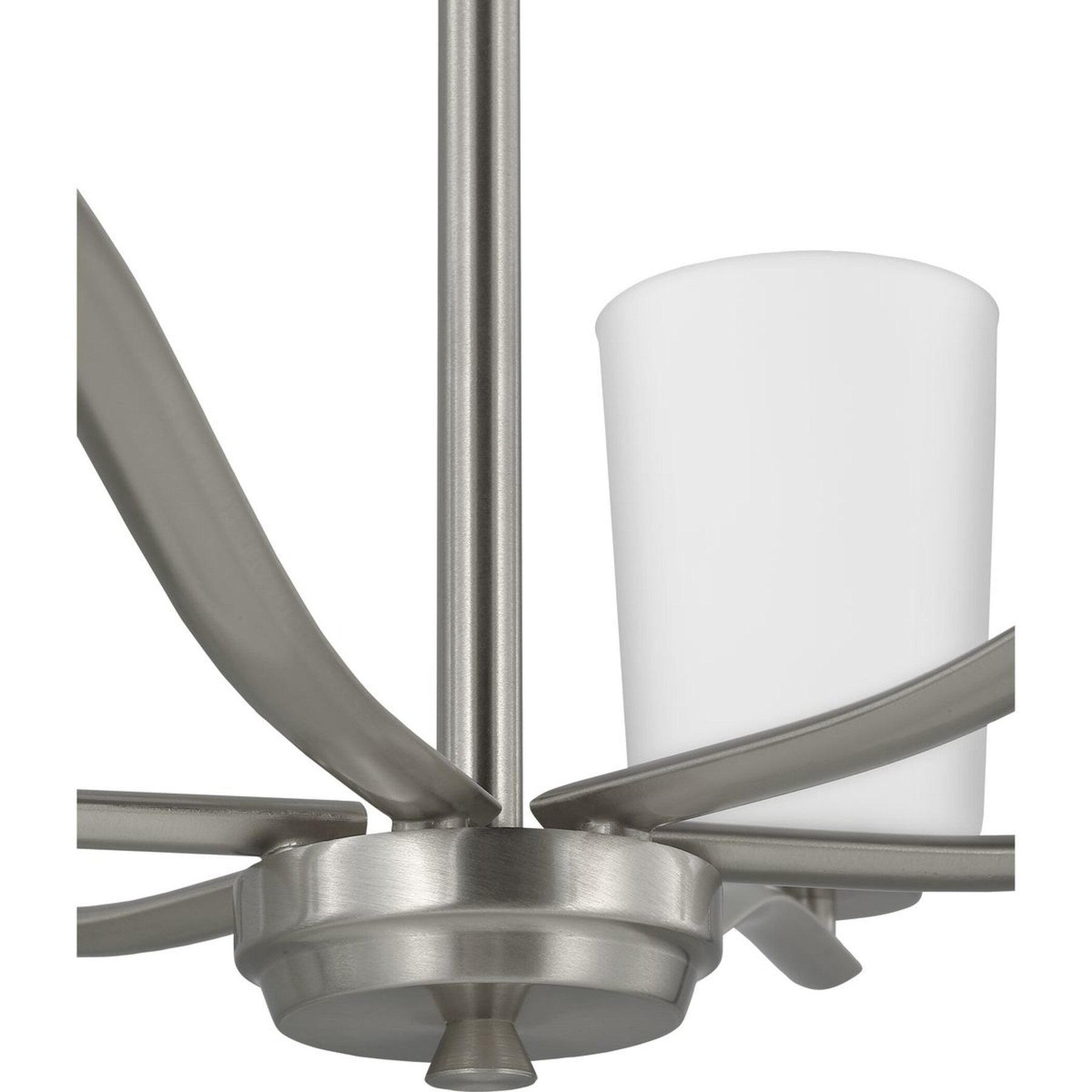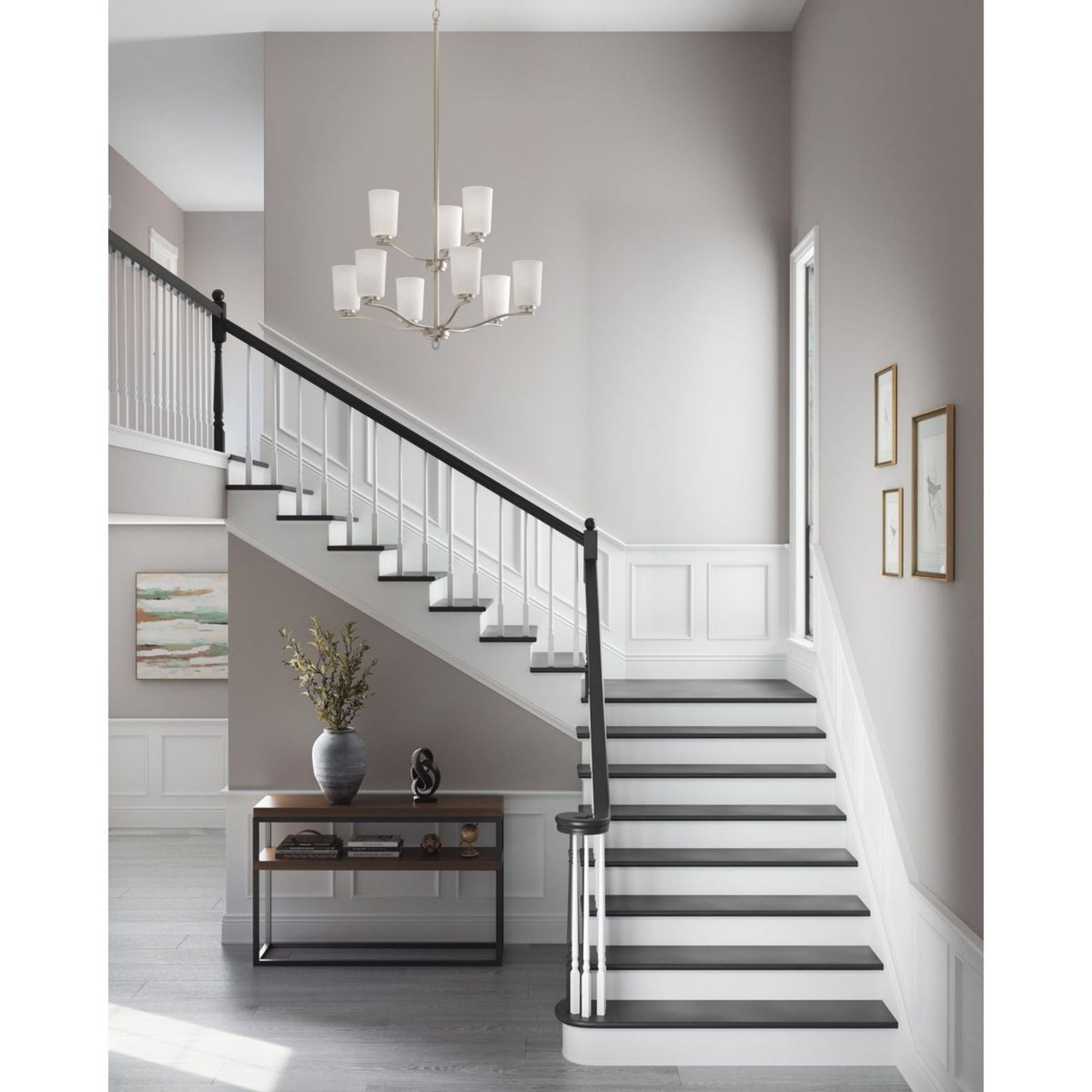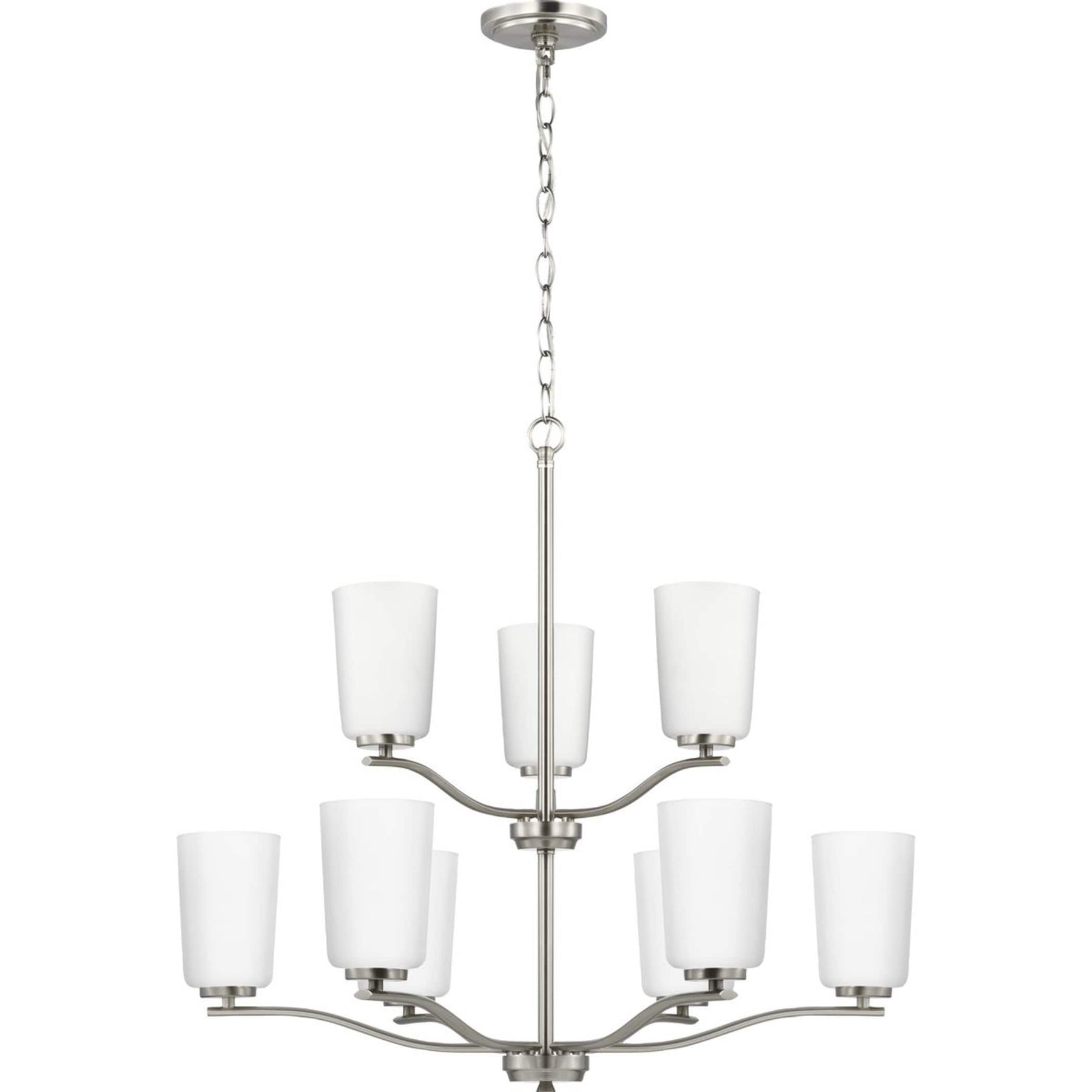 The Adley 9-Light Transitional Chandelier by Progress Lighting elegantly marries modern and traditional design elements, making it a versatile choice for any contemporary or transitional space. Its brushed nickel finish and etched white glass shades exude sophistication, while the chandelier's two-tier design ensures ample illumination. Designed for easy installation, this fixture is sure to enhance any dining room, living area, or grand foyer.