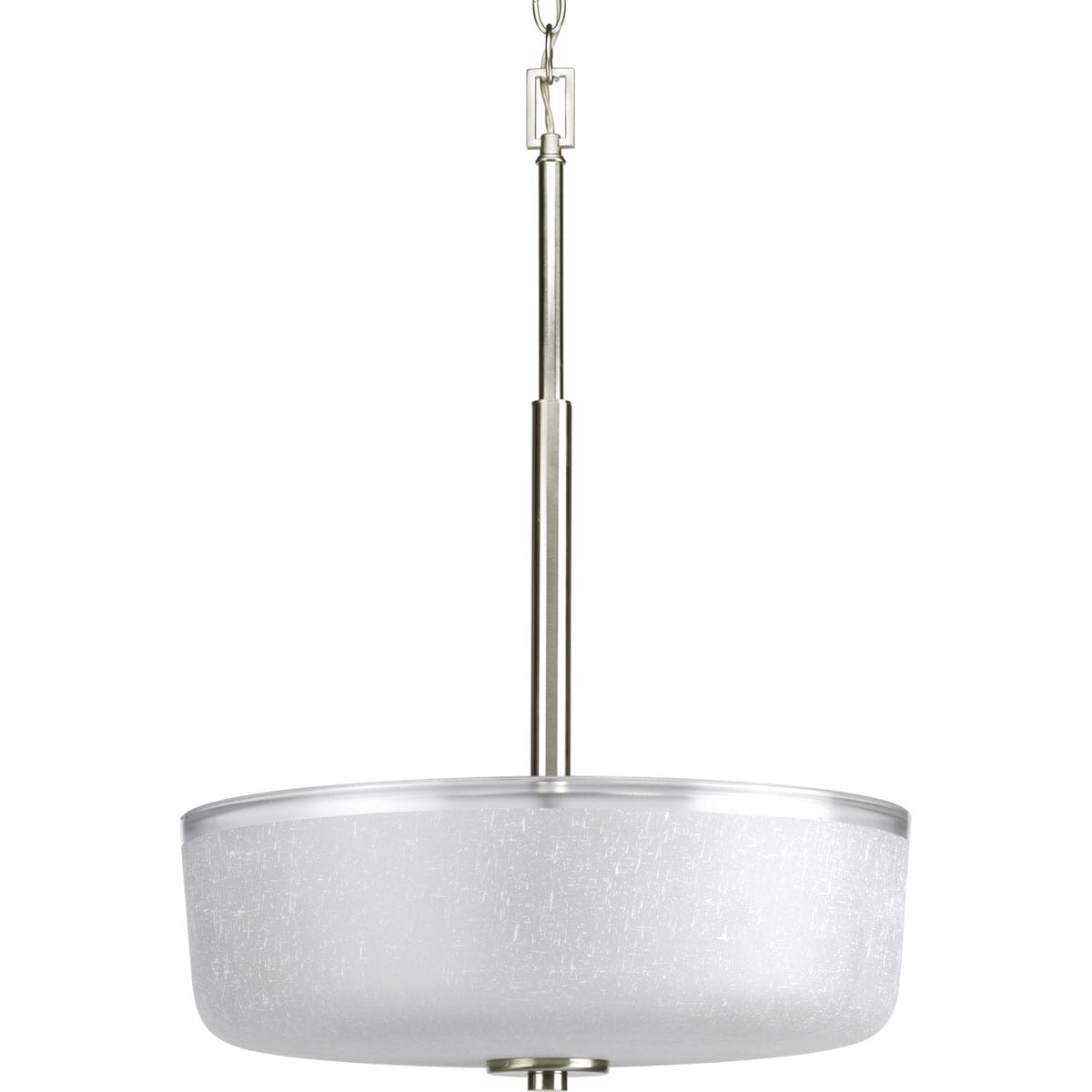 The Progress Lighting Alexa 3-Light Chandelier seamlessly blends traditional charm with modern style. Featuring a sleek brushed nickel finish and elegant white linen glass shades, this fixture adds a sophisticated touch to any dining room, living room, or bedroom. Its transitionally styled design ensures compatibility with a variety of décor settings, providing tasteful illumination to your most beloved spaces.